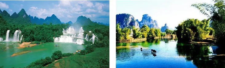 “中国最美瀑布”德天跨国大瀑布、“西南三大名泉”靖西鹅泉、花千骨拍摄地“峒那屿湾”、广西民族博物馆、崇左太平古城、大新明仕田园、
