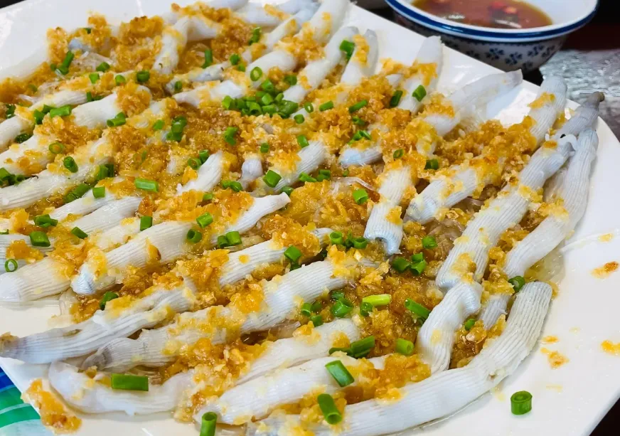 这东西长得像蚯蚓,看着吓人,吃着是真香。做法不复杂:沙虫洗净,去掉沙袋(这步最考功夫),铺上炸得金黄的蒜蓉和粉丝,大火猛蒸几分钟。出锅时淋上热油,“滋啦”一声,香气扑鼻。咬一口,脆、甜、鲜,口感像某种脆嫩的笋,完全没有腥气。敢吃这一口,你才算真到了北海。