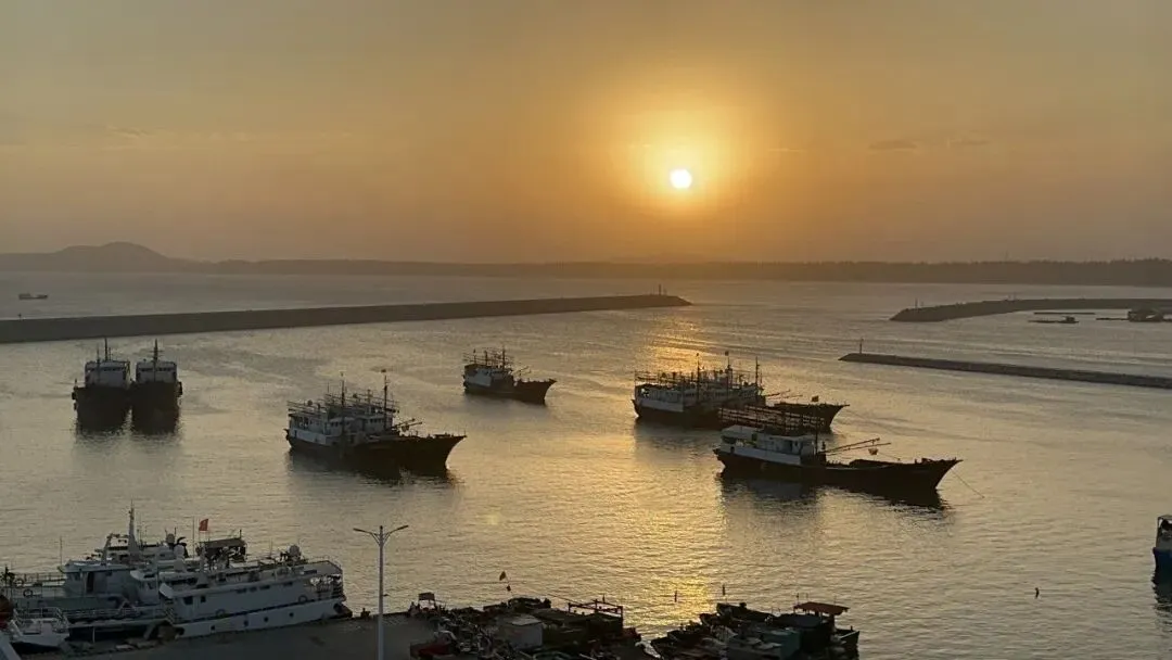 夕阳西下,酒店窗外汽笛声声,满载而归的渔船依次进港靠岸,码头上全是等着进货的商贩,一派热闹又真实的渔港景象。