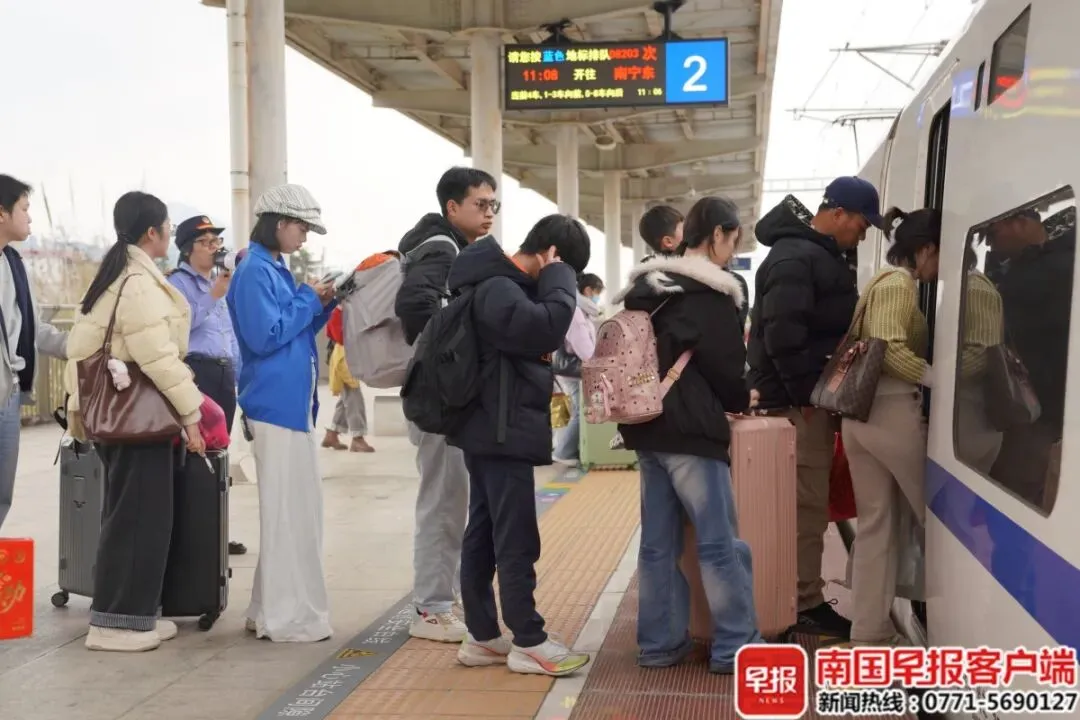 随着春节假期结束,各地高校陆续开学,学生流与返岗流叠加形成出行高峰。2月27日,南国早报全媒体记者从国铁南宁局获悉,该局自2月27日起至3月8日加开1096列动车组列车,为返程客流保驾护航。针对广西区内学生返校和务工返岗时段相对集中、方向相对固定的特点,该局充分依托大数据分析,提前摸排区内各高校开学时间,对接各地人社部门了解务工人员出行动态,优化调整运能结构。学生旅客在鹿寨北站乘车。卢穗萍摄