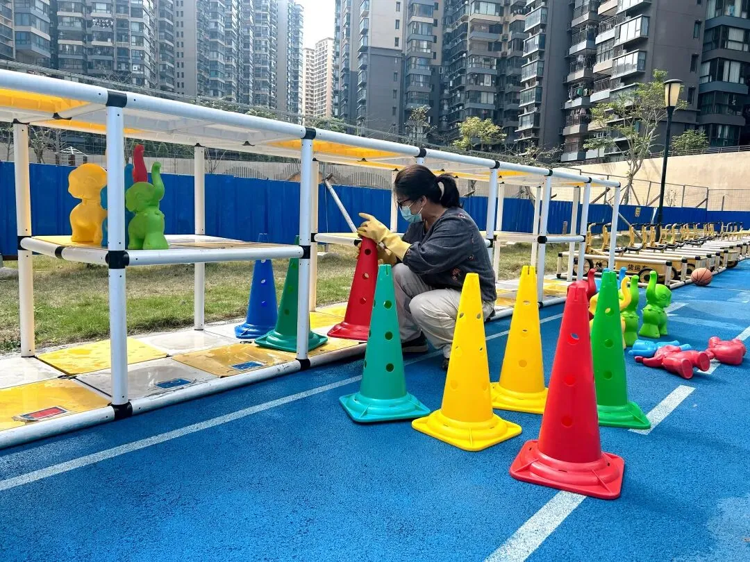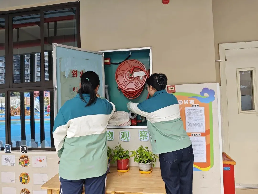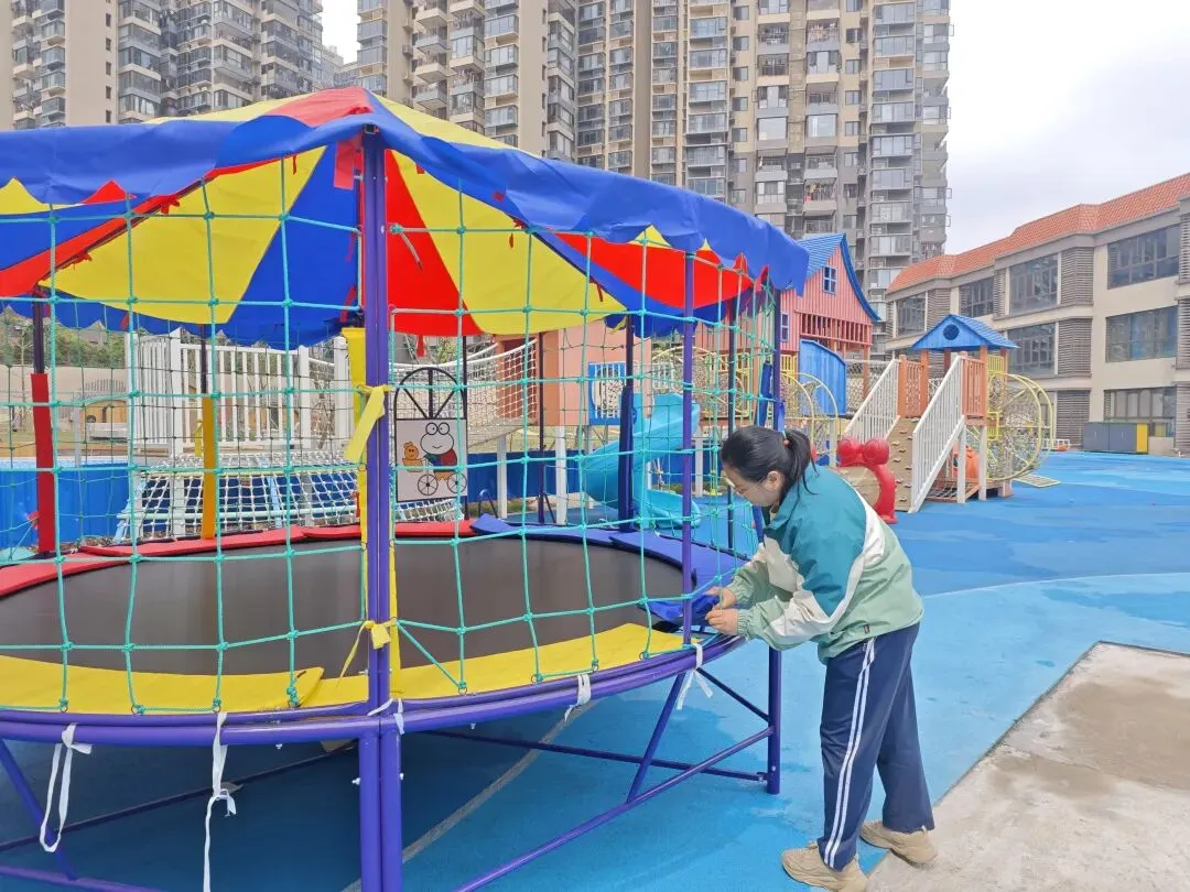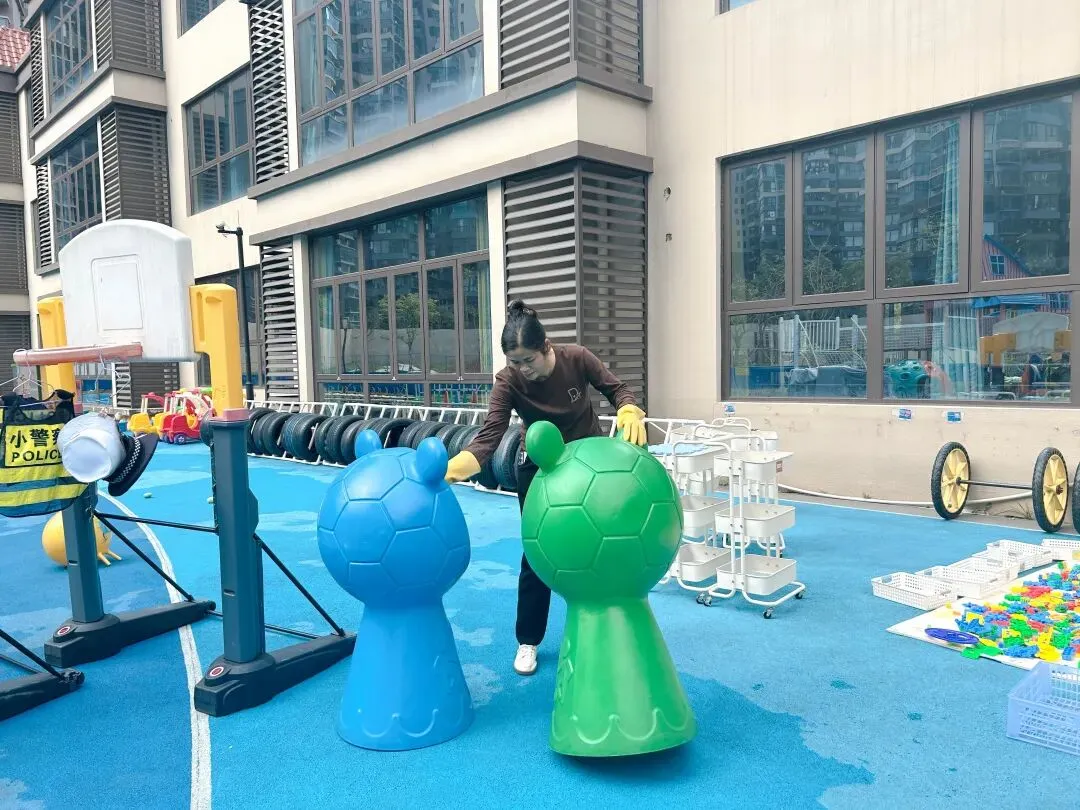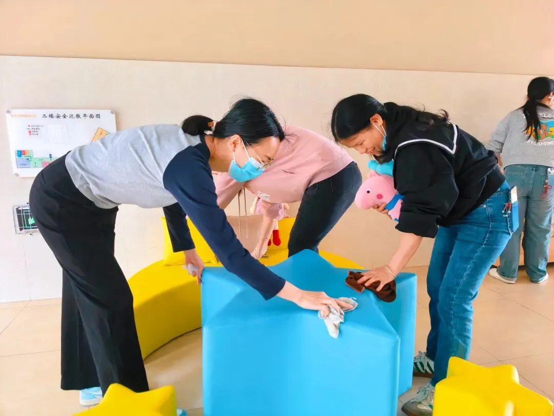 拂去旧尘窗几亮,剪来春色饰新妆,环创无声皆有意,只待童声满画堂。为给孩子们营造干净、整洁、温馨的成长环境,爱国卫生运动在园所内热火朝天地开展起来。全体教师分工协作、默契配合,对教室、寝室、走廊等区域进行全面清扫、消毒消杀,擦拭桌椅、整理玩具、清扫地面,不放过任何一个卫生死角。后勤部牵头,各部门配合,按照排查“零盲区”,安全“零隐患”要求,对全园所有户外大型玩具以及体育器械设备、门卫室、消防器材、消防通道、食堂等进行了全面、细致地排查。