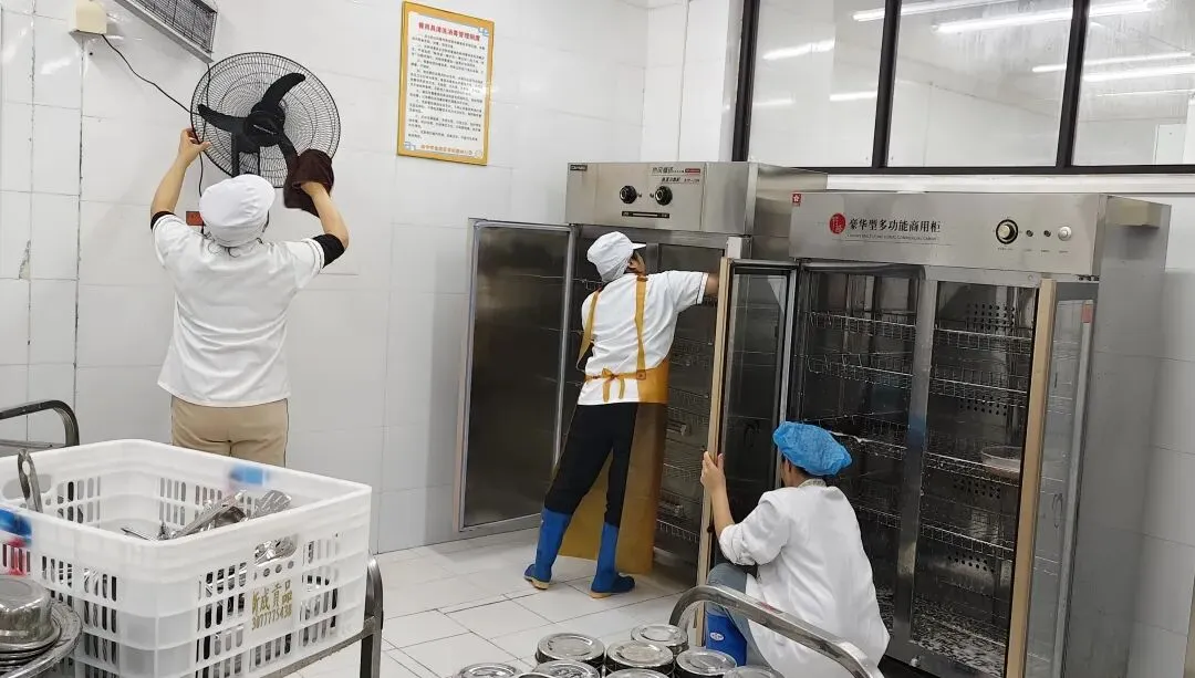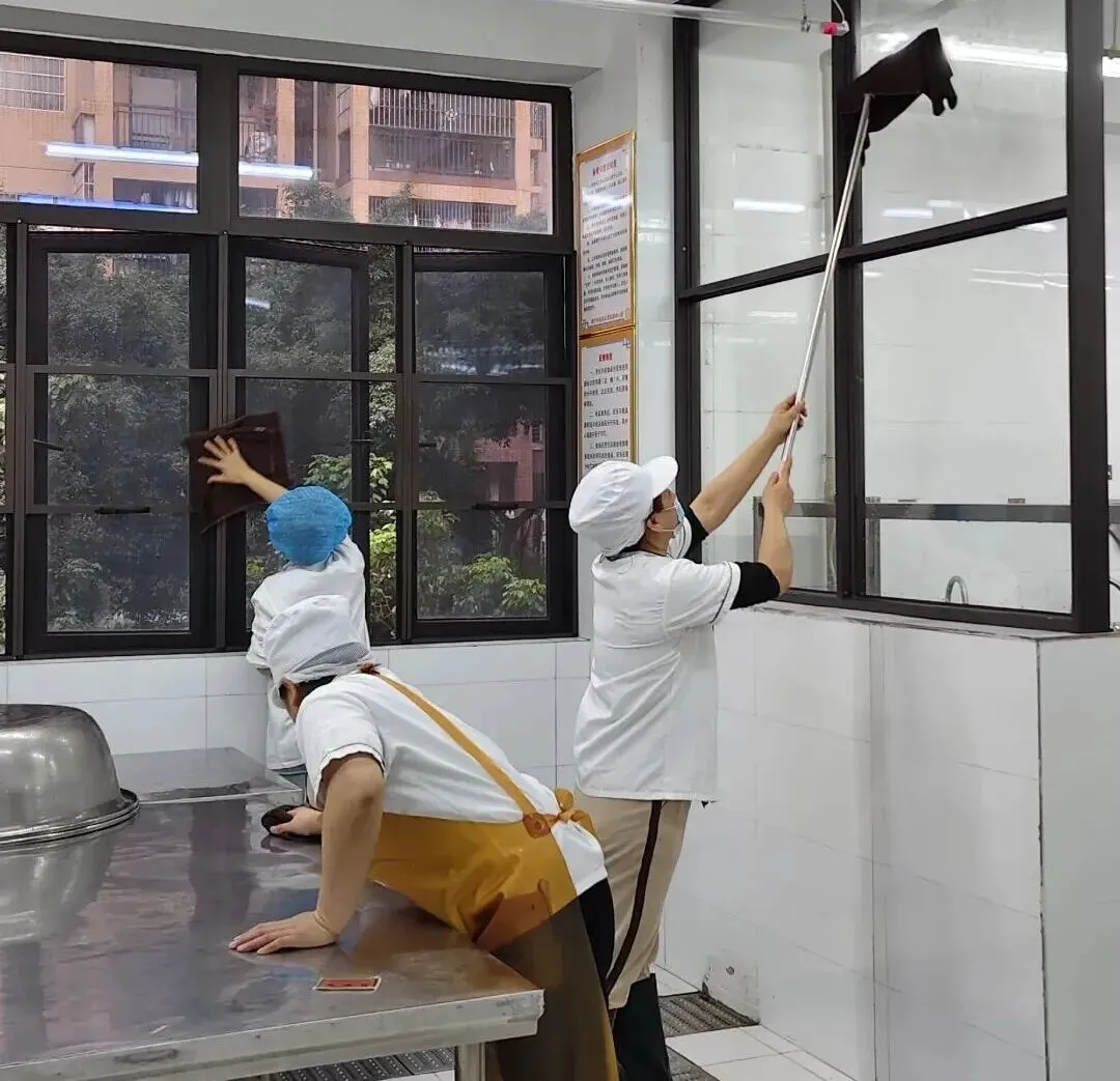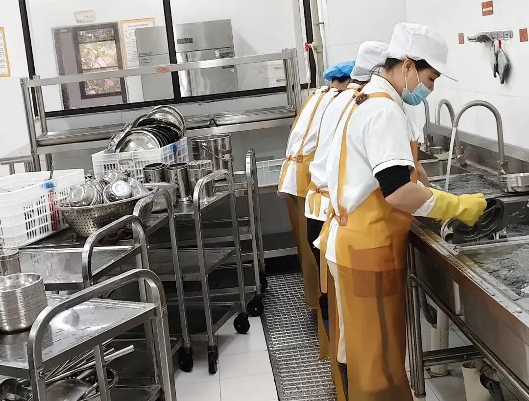 厨房人员对食堂进行全面清洁整理,规范餐具清洗消毒,严把食品卫生关,切实保障幼儿饮食安全。
