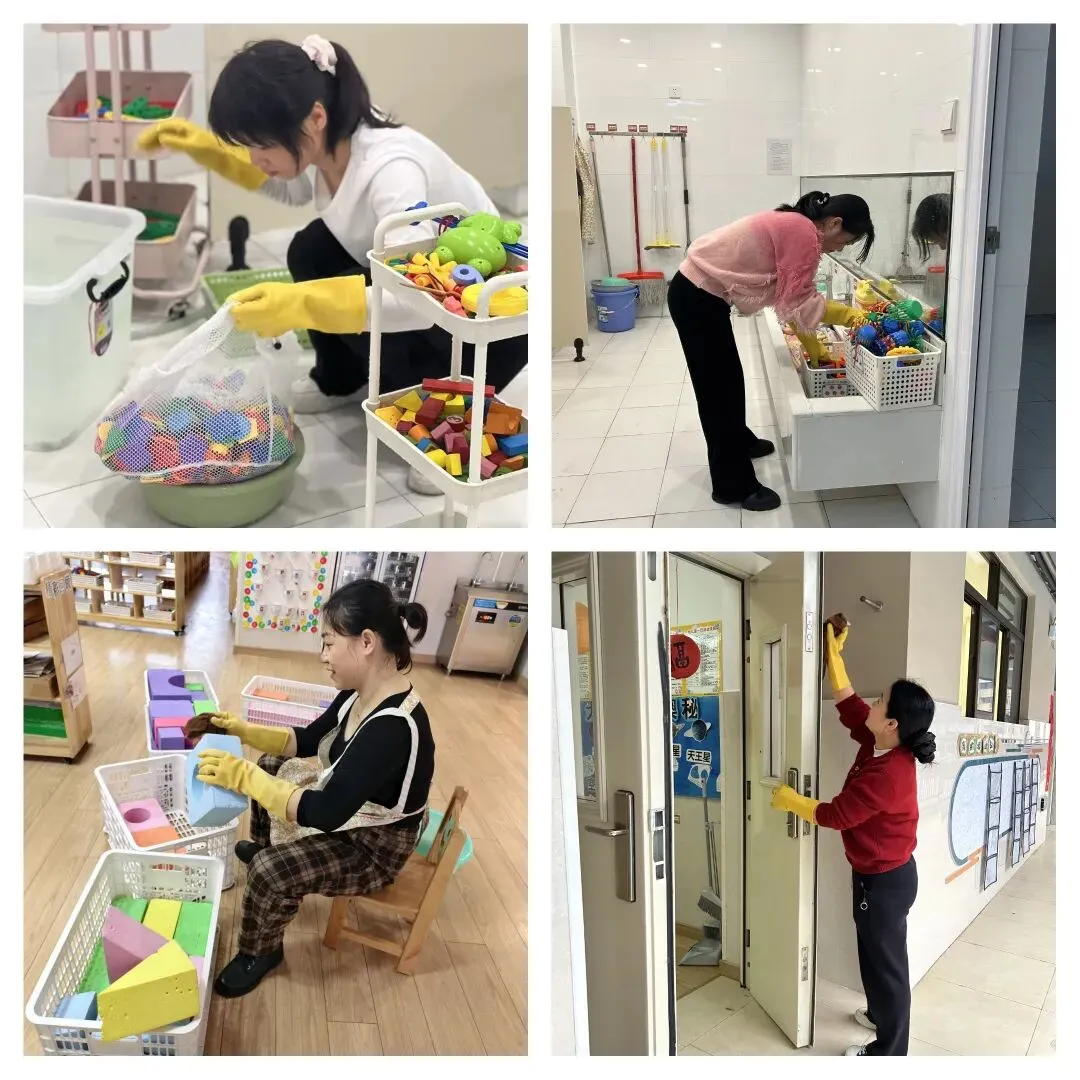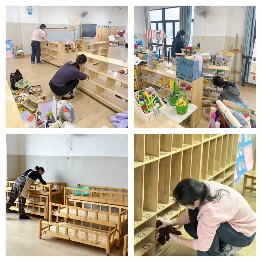 全体教职工凝心聚力,提前行动、细致部署,对全园开展无死角清洁消杀,对重点区域进行彻底清扫,对高频接触物品严格消毒;同时对现有设施设备进行收纳整理,做到分类归置、规范存放,为幼儿返园筑牢健康安全防线。