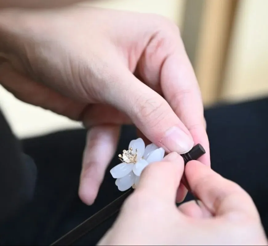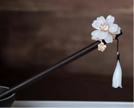 簪是中国古代用以固定发髻或冠帽的长针形饰物,兼具实用与美观的功能,而用玉做的簪最早出现在新石器时代晚期。簪的造型丰富,长短不一,可制成圆头、扁头、方头等多种样式,通过镂刻、錾花、盘花、绞丝等工艺,在簪身和簪顶饰上各种精美图案。