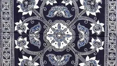 蜡染的制作方法古朴精妙,用蜡在织物上绘制图案,再将织物浸染、煮沸、漂洗,被蜡覆盖的花纹,未曾因浸染着色煮沸去蜡后即成一幅精美的蜡染。