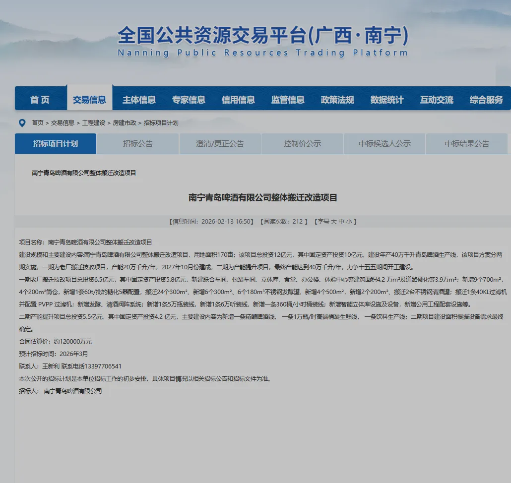 2026年2月13日,广西公共资源交易中心发布《南宁青岛啤酒有限公司整体搬迁改造项目》招标计划。