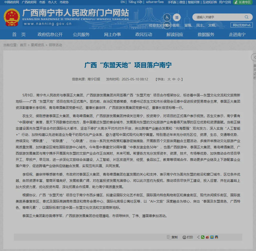 2025年5月9日,南宁市人民政府与泰国正大集团、广西旅游发展集团共同签署广西“东盟天地”项目合作框架协议,计划对青岛啤酒原厂区进行改造。