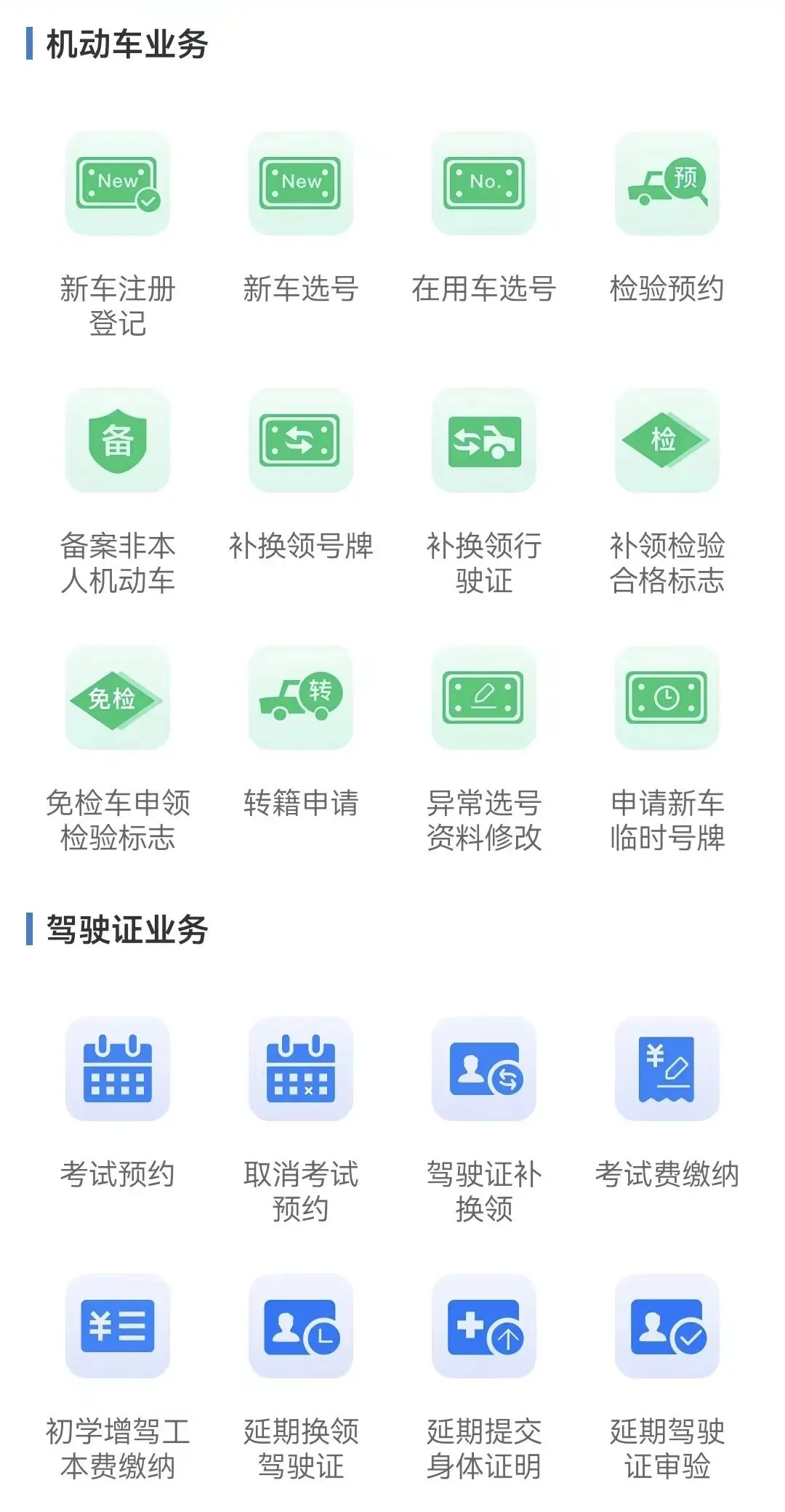 车辆“电警”(公安机关交通管理部门通过交通技术监控设备采集确认的违法行为)、驾驶证补换领。
