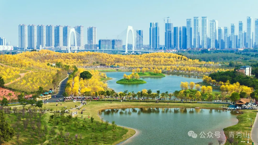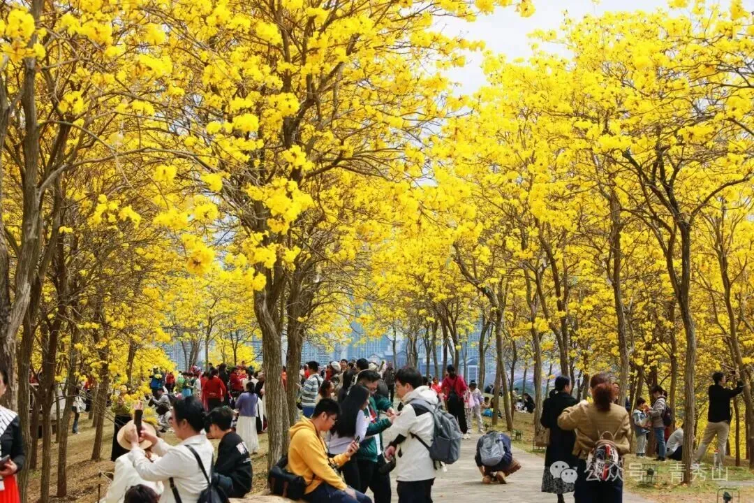 这里是南宁面积最大、景观最佳的黄花风铃木种植地,登高远眺,满枝金黄与绿城的青山绿水、城市天际线相融,抬头是湛蓝的天,低头是铺展的金,春风拂过,花瓣轻轻颤动,像风铃在耳边轻轻作响,又像记忆里那些没说出口的温柔,悄悄落在心头微博。这一刻才明白,歌里的小黄花,从来不是单一的模样,它是青春里的懵懂,是回忆里的温暖,更是南宁春日里,这份触手可及的浪漫。