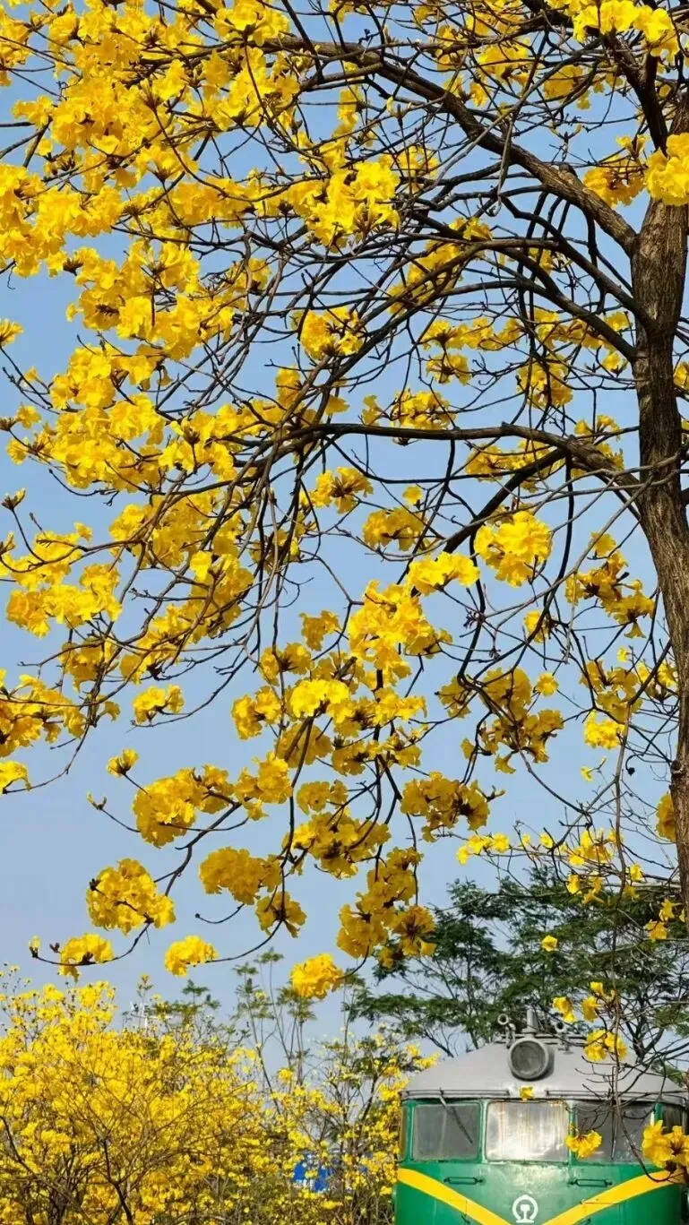 南宁的春日,把故事的小黄花种满了全城,不止青秀山的风铃谷,江南公园的黄花风铃伴着复古火车头绽放,五象平乐大道的金色长廊绵延数里。
