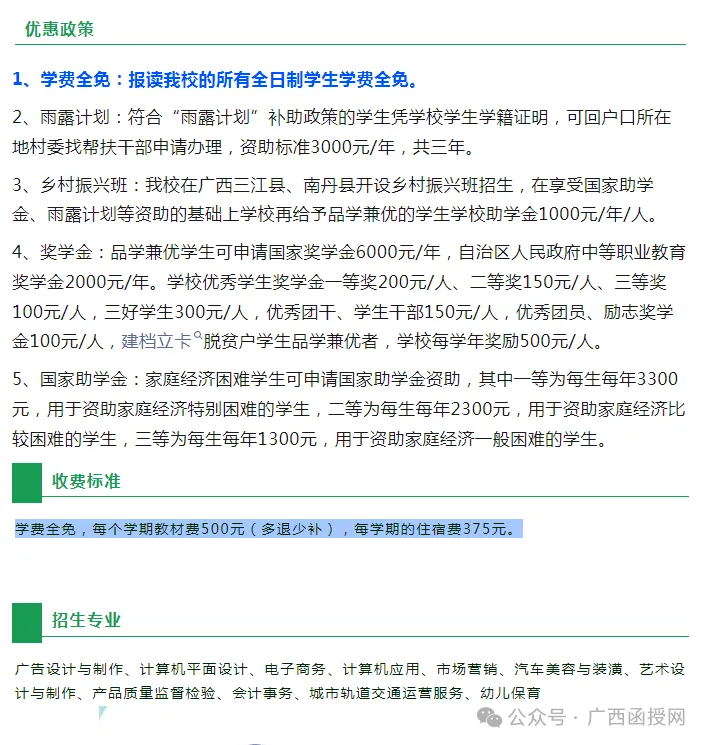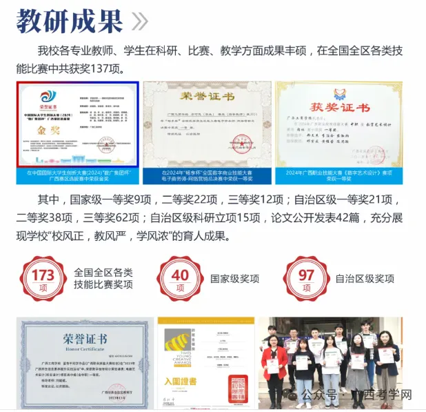 升学优势:学校高度重视学生的成长和发展,以升学为导向,就业相结合,学校设有“升学班”,学生参加职教高考,可升读广西区内的大专、本科院校。