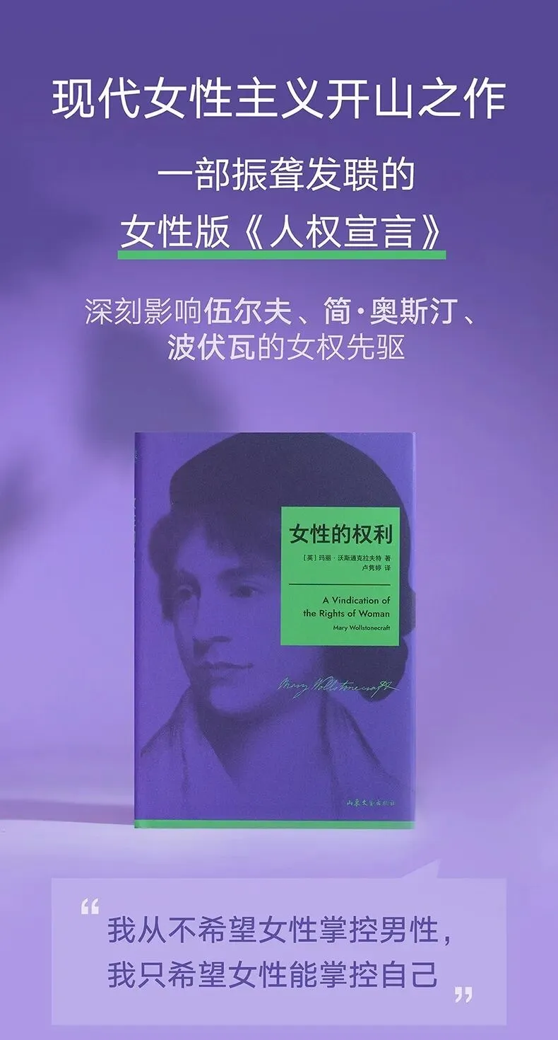 2)《女性的权利》:现代女性主义开山之作,来自1792年的女权祖师姥玛丽·沃斯通克拉夫特的奋力呐喊,她批判女性教育的缺陷,指出其旨在培养附属品,而非有尊严的独立个体;她驳斥“女性天生柔弱、理性不足”的偏见,指出女性的无知与顺从源于后天被剥夺发展机会;她强烈主张女性应获得与男性同等的理性教育、政治权利和社会地位。