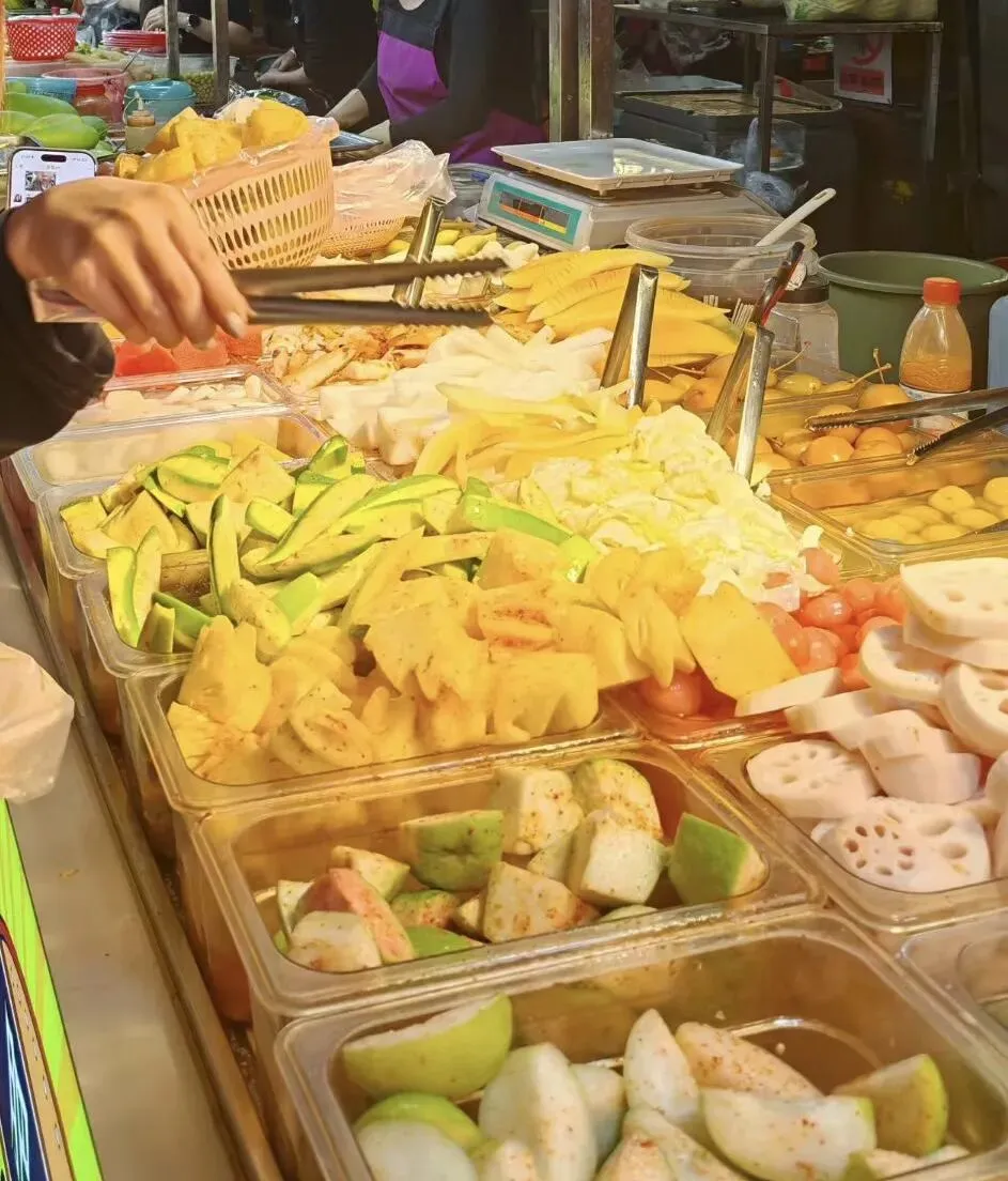 来广西怎么能不吃酸嘢!!谁能拒绝酸酸甜甜有点点辣辣的水果!!酸嘢的价格基本都是15元/斤 就是要看看它的水果种类多不多,新不新鲜 但基本都新鲜的因为很多人点啊……我们边夹店员阿姨就边加