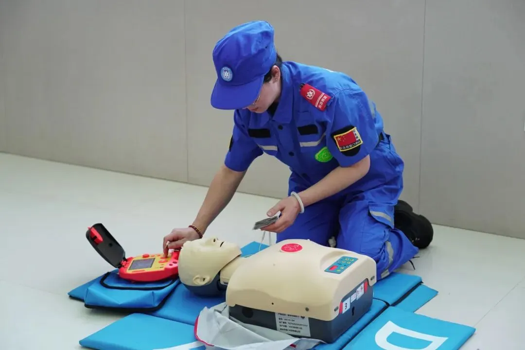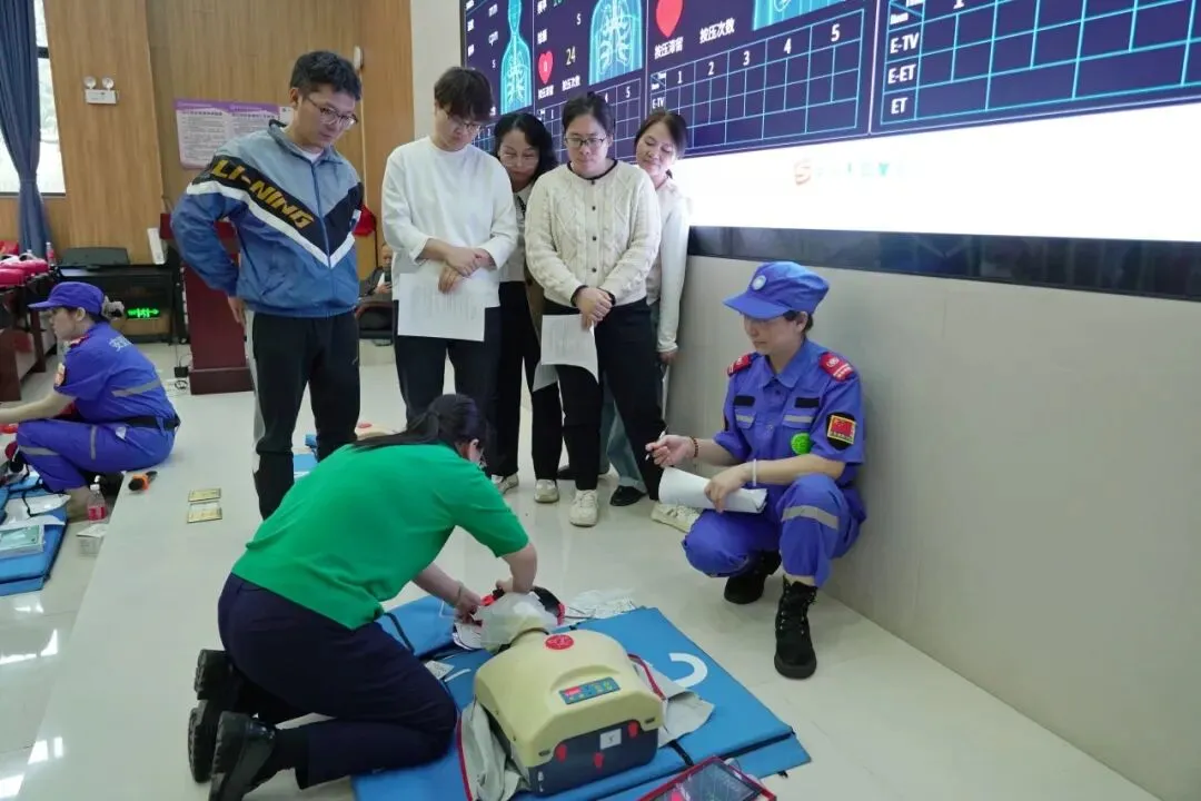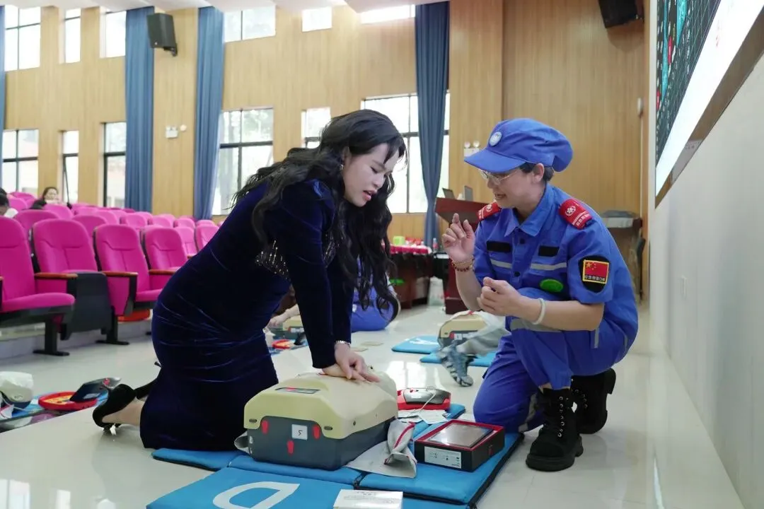 理论讲解结束后,培训进入实践操作环节。在心肺复苏与AED使用训练区,参训教师在模拟人教具上进行胸外按压练习,并在助教指导下亲自操作AED训练机,熟悉开机、电极片贴放、语音提示跟随等流程。在气道异物梗阻急救训练区,参训教师分组进行海姆立克急救法实操练习。