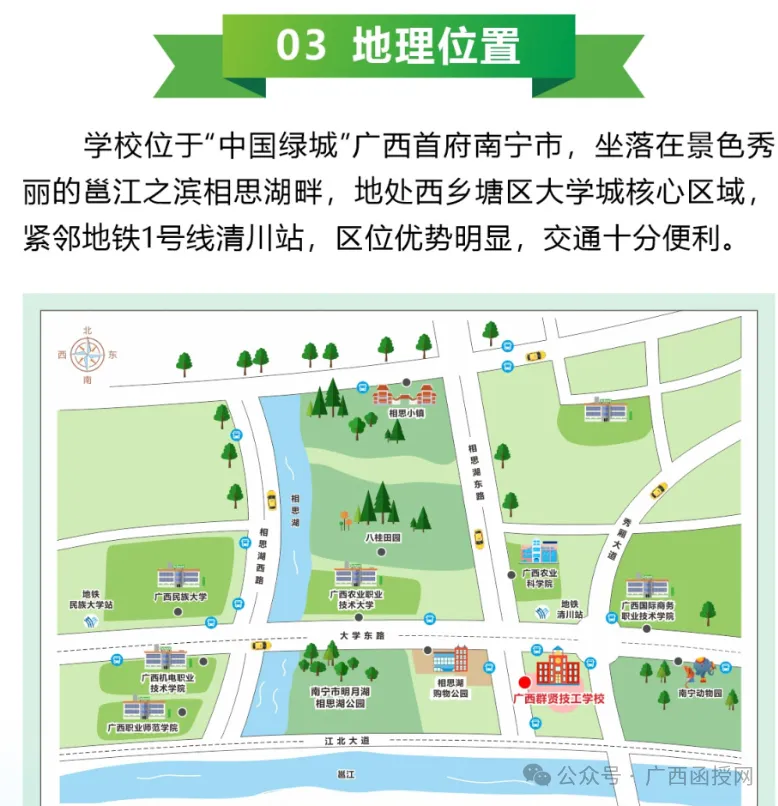 南宁市西乡塘区相思湖东路8号 地铁1号线青川路口B出口周老师电话:18907773301 在线QQ:511566526广西群贤技工学校与十多所高职院校签订联合办学协议,所有学生均可直接报考高职院校。