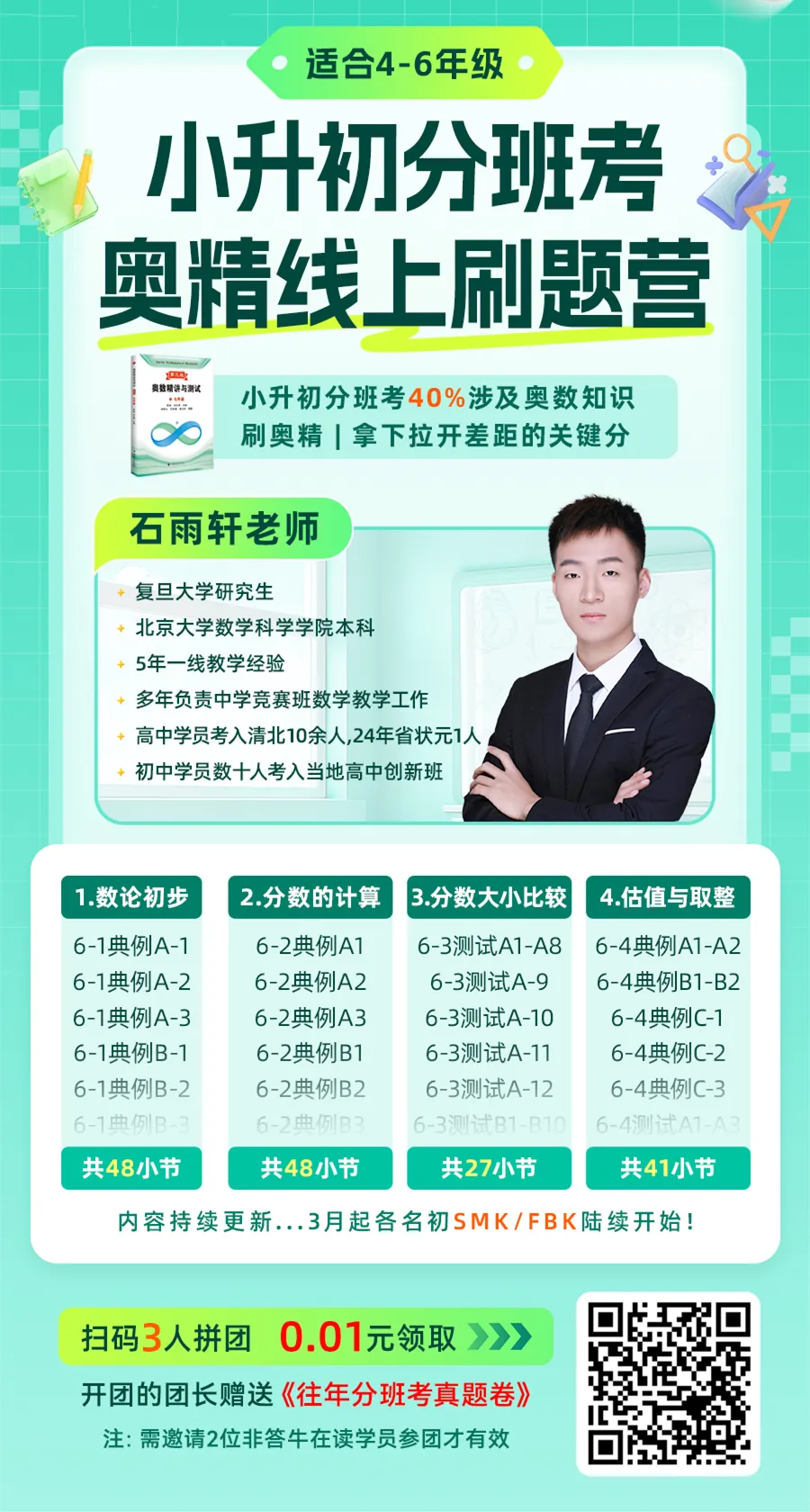 南宁小升初FBK/SMK陆续开启FBK有40%的内容会涉及奥数如何攻克难题,入选火箭班?建议扫码报《奥精线上刷题营》保送北大数院名师带你刷奥精资料领取/升学咨询/进升学交流群