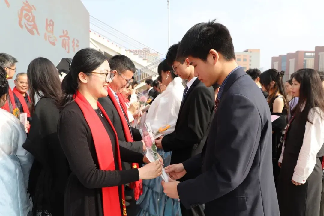 伴随着温情的旋律,学子代表依次为教师献上鲜花。有的同学久久握着老师的手,有的悄悄拭去眼角的泪花。三年的朝夕相处,此刻化作一个微笑、一个拥抱、一句“老师,谢谢您”。