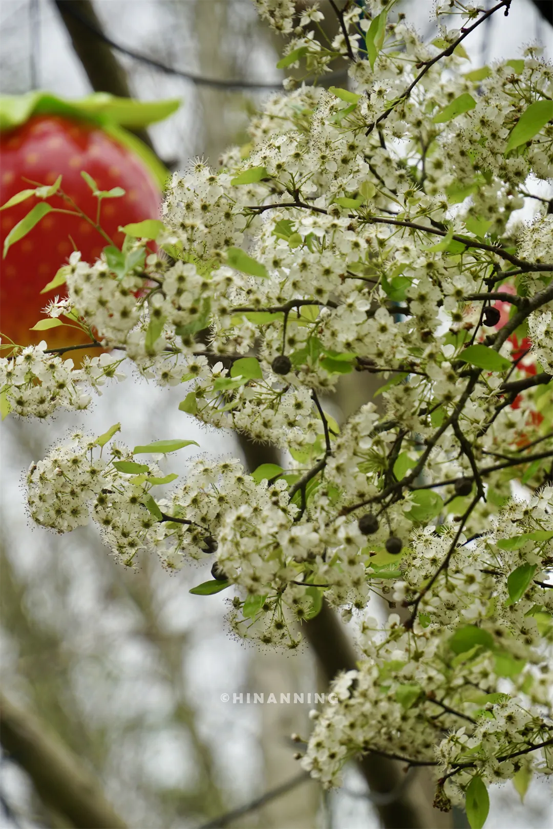 叶子花园对面的豆梨花正值盛花期,豆梨花形精巧,花色纯净如雪。微风拂过,花瓣轻扬,满树花朵洁白如云,勾勒出一幅清新雅致的春日画卷。