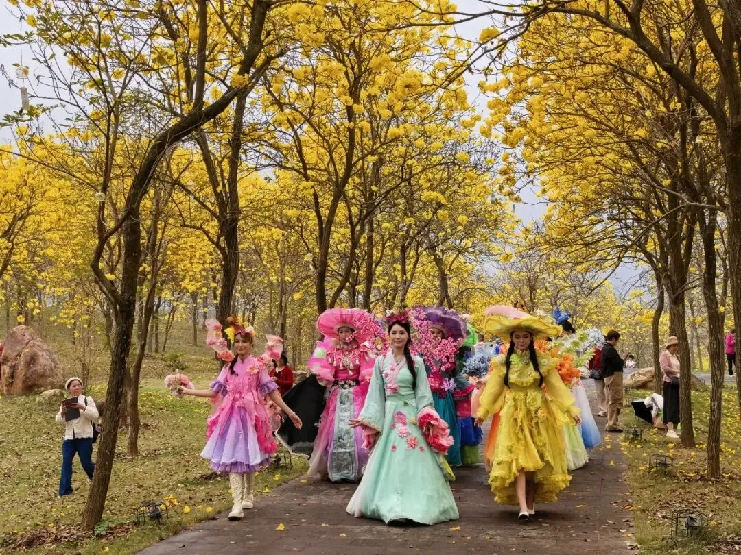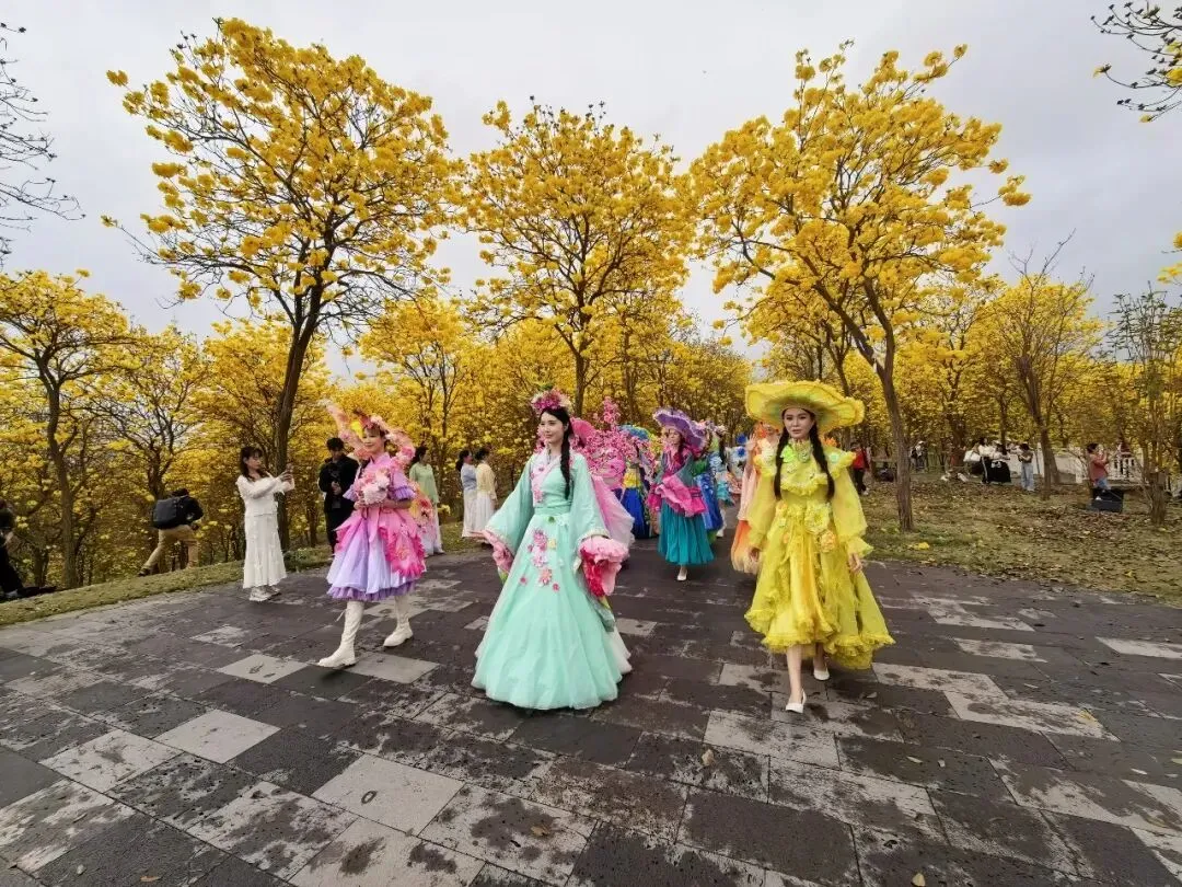 黄花风铃木原产于美洲,上世纪进入中国,目前在中国南方省区广泛种植。花色金黄夺目,先开花后长叶,其花冠形似风铃,故而得名。微风轻拂,轻盈的花枝在风中摇曳生姿,恰似一串串风铃随风起舞,美不胜收。当满树繁花竞相绽放,风铃状的黄花簇拥在一起,将天空映衬得格外金黄灿烂。成片成片的金黄花海一望无际,仿佛是大自然为市民游客精心打造的绚烂舞台。游客们穿梭其中,纷纷驻足留影,将这独属于春日的绚烂定格在镜头里,脸上洋溢着幸福的笑容。
