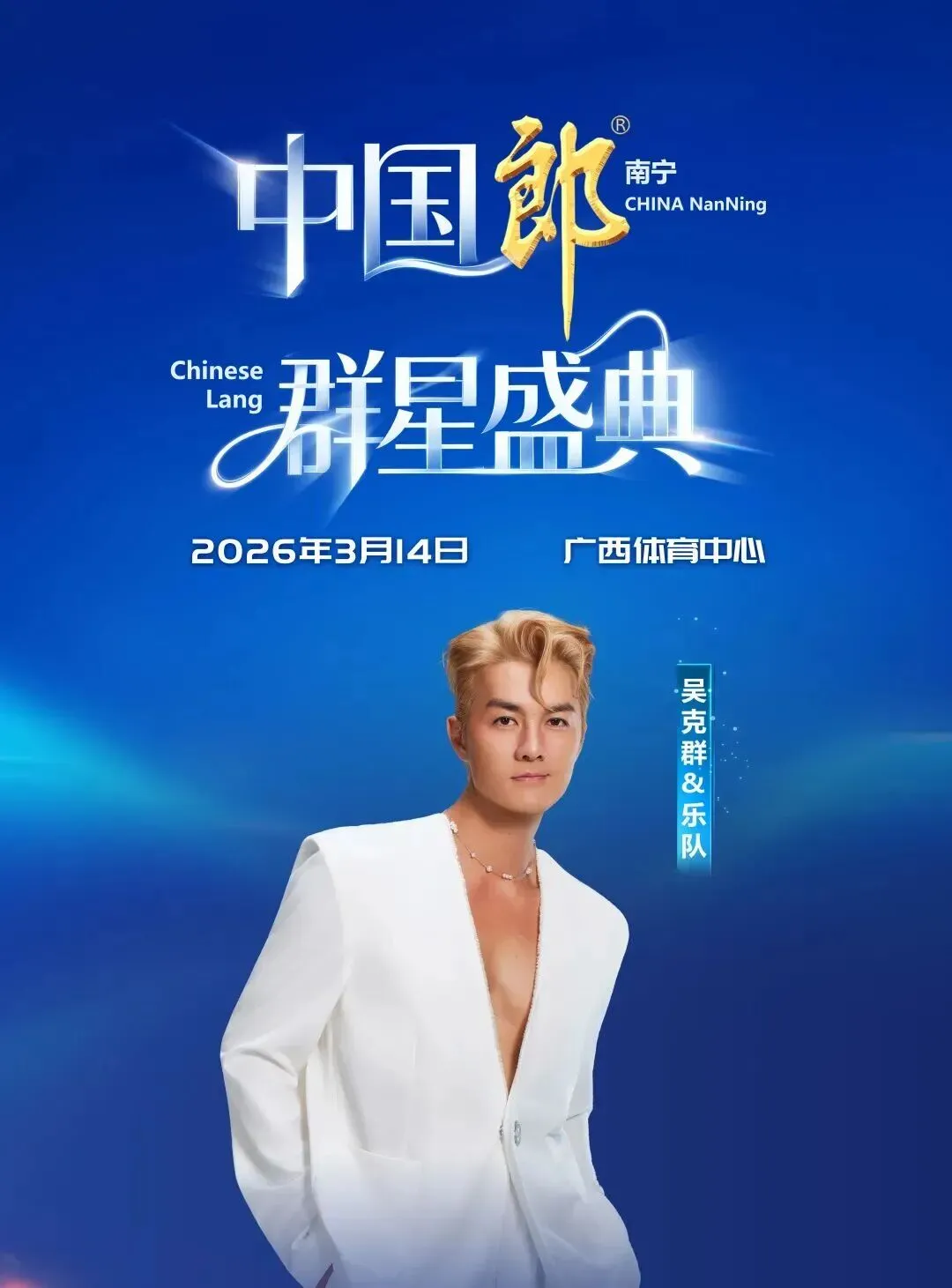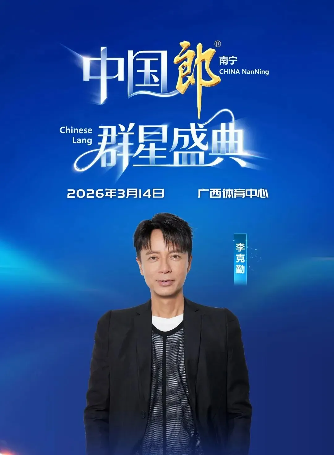 2026年3月14日,“中国郎·群星盛典” 即将在绿城南宁点燃夜空,以音乐为酒,邀您共醉一场跨越世代、融合情怀的璀璨之夜!届时,广西体育中心将化身音乐宇宙,李克勤、张韶涵、陈慧娴三大华语乐坛“传奇之声”领衔,吴克群、弦子、零点乐队等实力音乐人倾情加盟,以多元风格编织一场跨越代际的视听狂欢。
