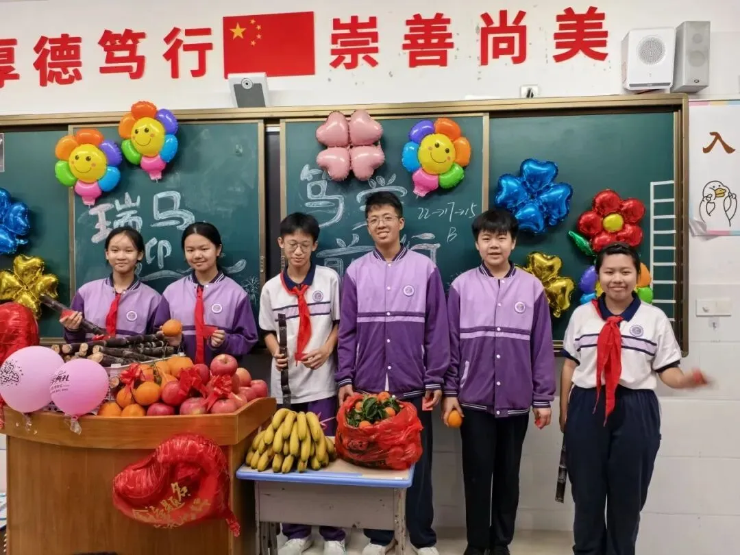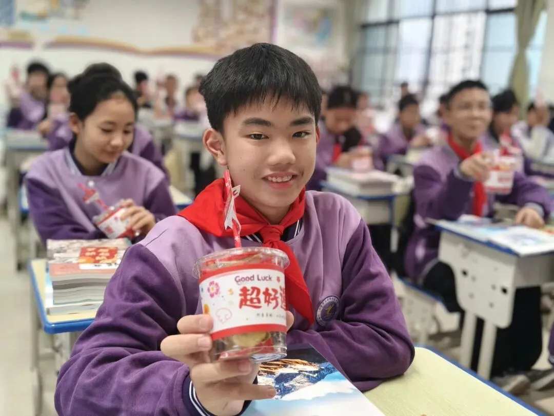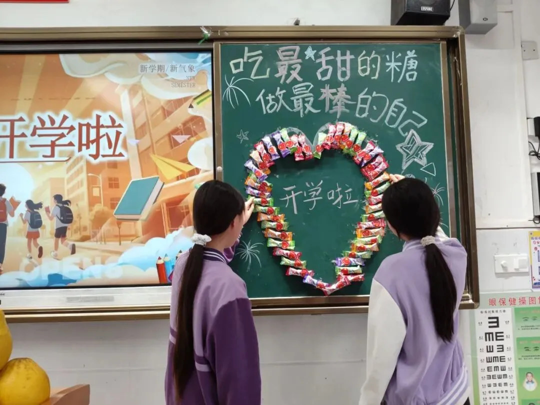 走进各班级教室,映入眼帘的是老师们精心布置的“开学惊喜”:黑板上绘着欢迎板报和励志寄语,每一张课桌上整齐摆放着系有彩带的新课本,有的班级还贴心地准备了象征“大吉大利”的橘子和寓意“平安喜乐”的果冻,五彩气球点缀其间,整个教室洋溢着温馨而欢快的氛围。