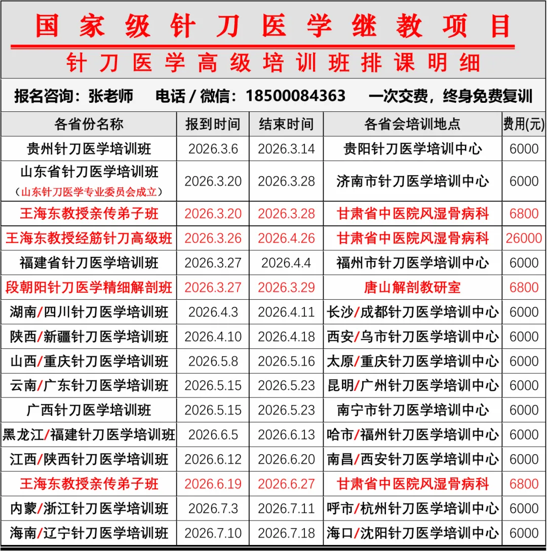 腰 背 部 | ①针刀治疗腰段棘上韧带损伤 ②针刀治疗棘间韧带损伤 ③针刀治疗腹外斜肌损伤 ④针刀治疗腰肋韧带损伤 ⑤针刀门诊治疗、示教 | 第六天(全天) 星期四 |