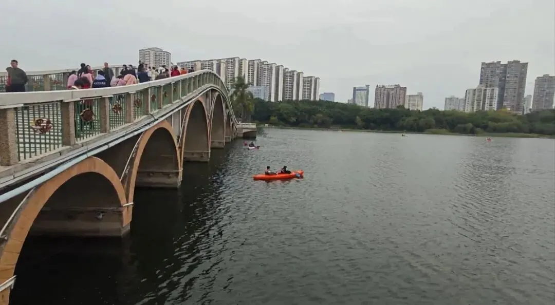 - 另一班大人(两位儿媳)“超级陪玩”,带着三个孙辈到桥东的湖面,陪他们划皮划艇、坐小游船。