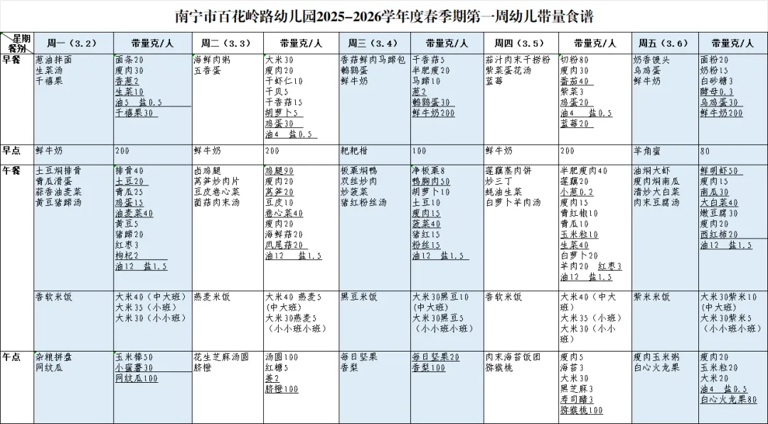 【百花·美食】南宁市百花岭路幼儿园第一周幼儿带量食谱
