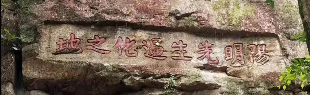 拾级而上,石阶被岁月磨得温润,清风穿叠翠,雨雾润苍松,摩崖石刻隐于茂林之间,静待一场跨越时空的相逢。“阳明先生过化之地”——崖壁上这八个苍劲古朴的隶书大字,为嘉靖四十年王阳明弟子欧阳瑜所镌,每字径约六十厘米,右侧镌“大明嘉靖四十年闰五月吉日”,左侧留存题刻痕迹。