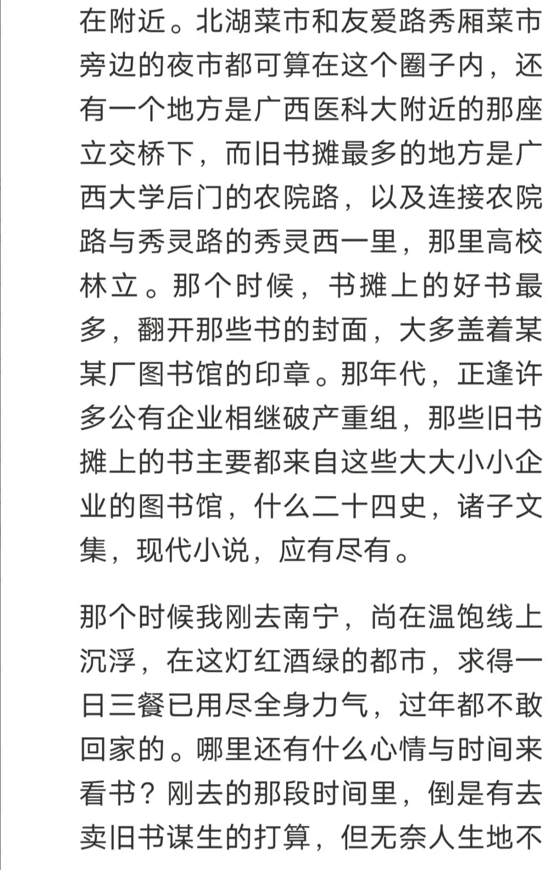 这些街边旧书摊主要分布在三个地方,一是明秀东路朝阳沟附近,即现在的明秀广场附近,那里有广西师范学院,广西中医学院两所高校。另外广西电影制片厂,原来的南宁地委也在附近。北湖菜市与友爱路秀厢菜市的夜市都属这一圈子内。还有一个地方是广西医科大附近的那座立交桥下,而旧书摊最多的地方是广西大学后门的农院路,以及连接农院路与秀灵路的秀灵西一里,那里高校林立。那个时候,书摊上的好书最多,翻开那些书的封面,大多盖着某某厂图书馆的印章。那年代,正逢许多公有企业相继破产重组,那些旧书摊上的书主要都来自这些大大小小企业的图书馆,什么二十四史,诸子文集,现代小说,应有尽有。