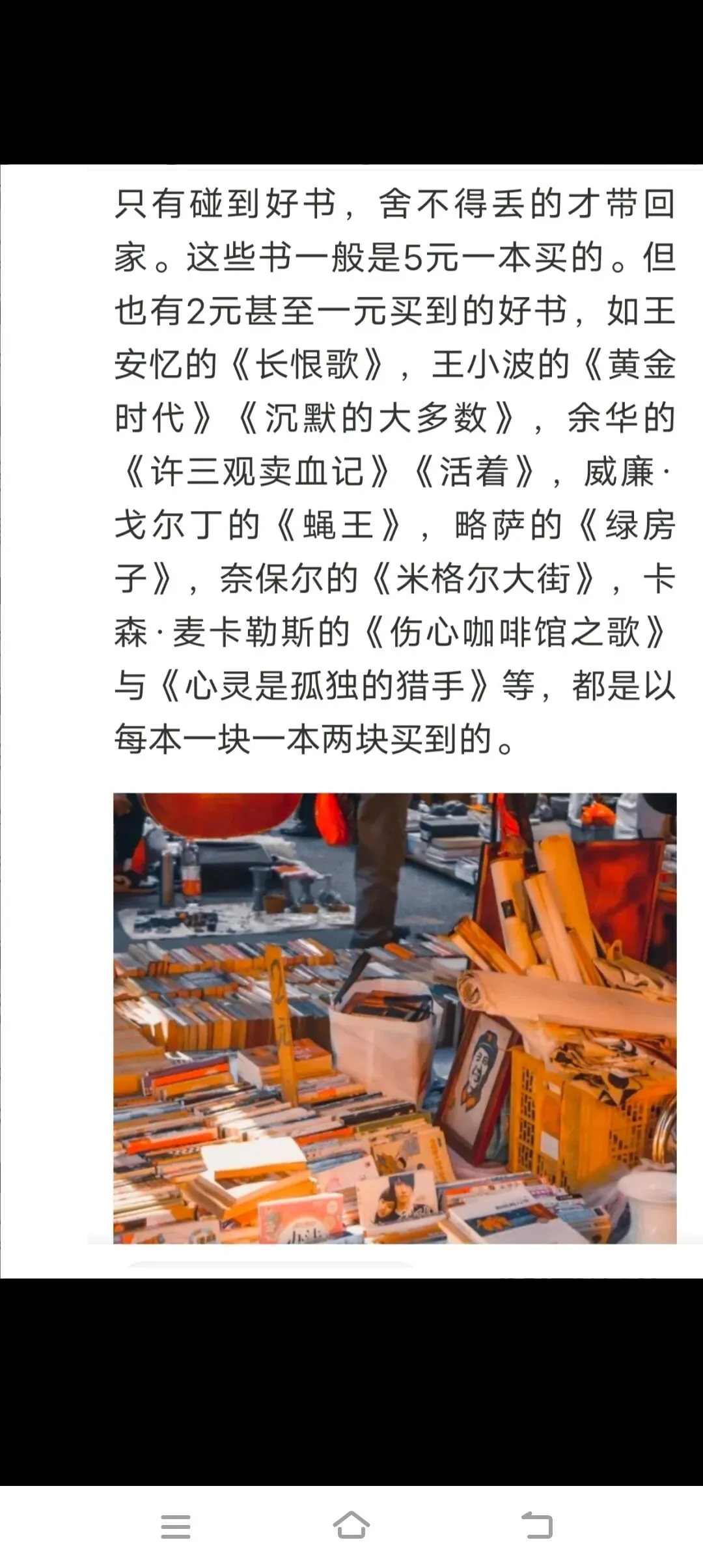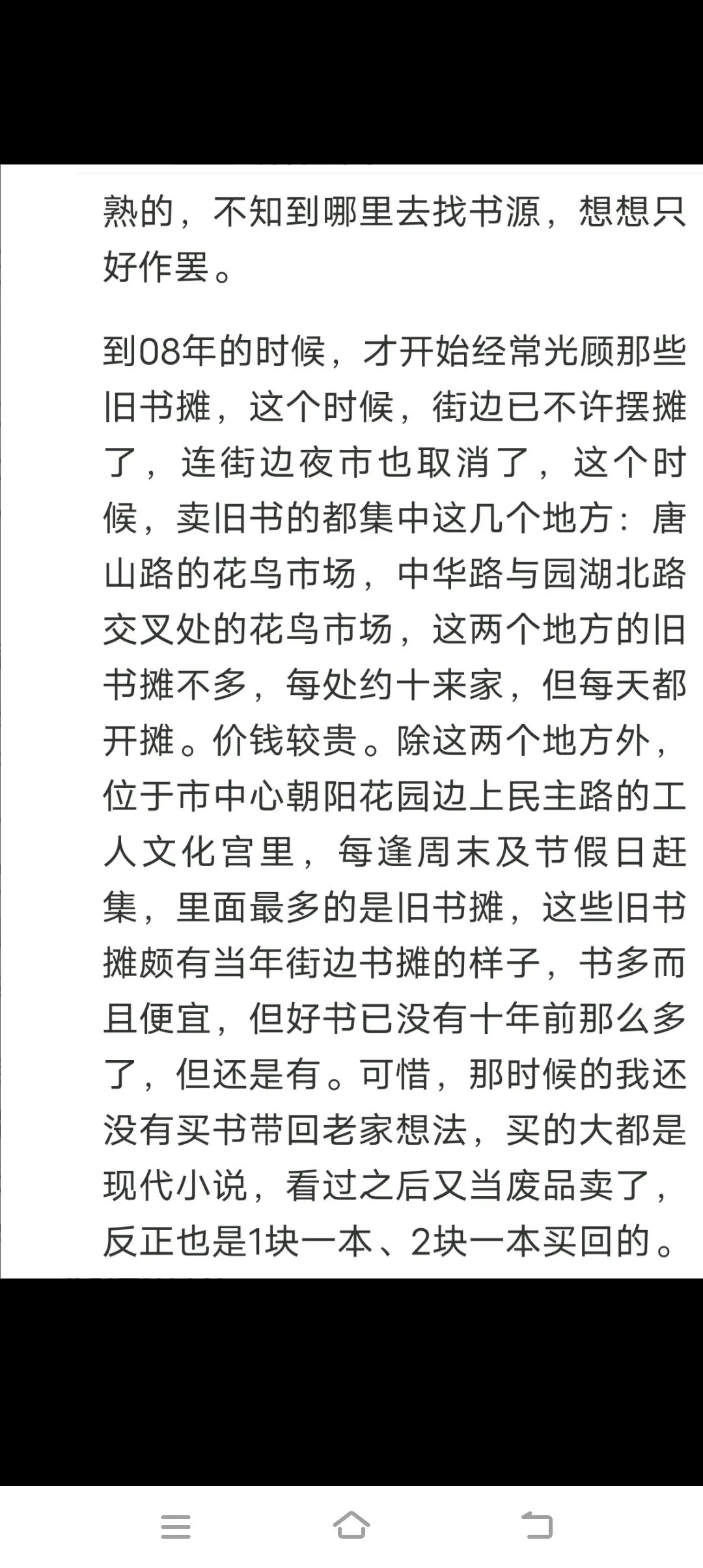 到08年的时候,才开始经常光顾那些旧书摊,这个时候,街边已不许摆摊,连街边夜市也取消了,这个时候,卖旧书的都集中这几个地方:唐山路的花鸟市场,中华路与园湖北路交叉处的花鸟市场,这两个地方的旧书摊不多,每处约十来家,但每天都开摊。价钱较贵。除这两个地方外,市中心朝阳花园边上的工人文化宫里,每个周末赶集,里面最多的是旧书摊,这些旧书摊颇有当年街边书摊的样子,书多而且便宜,但好书已没有十年前那么多了,但还是有。可惜,那时候的我还没有买书带回老家想法,买的大都是现代小说,看过之后又当废品卖了,反正也是1块一本、2块一本买回的。只有碰到好书,舍不得丢的才带回家。这些书一般是5元一本买的。但也有2元甚至一元买到的好书,如王安忆的《长恨歌》,王小波的《黄金时代》《沉默的大多数》,余华的《许三观卖血记》《活着》,威廉·戈尔丁的《蝇王》,略萨的《绿房子》,奈保尔的《米格尔大街》,卡森·麦卡勒斯的《伤心咖啡馆之歌》与《心灵是孤独的猎手》等,都是以每本一块一本两块买到的。