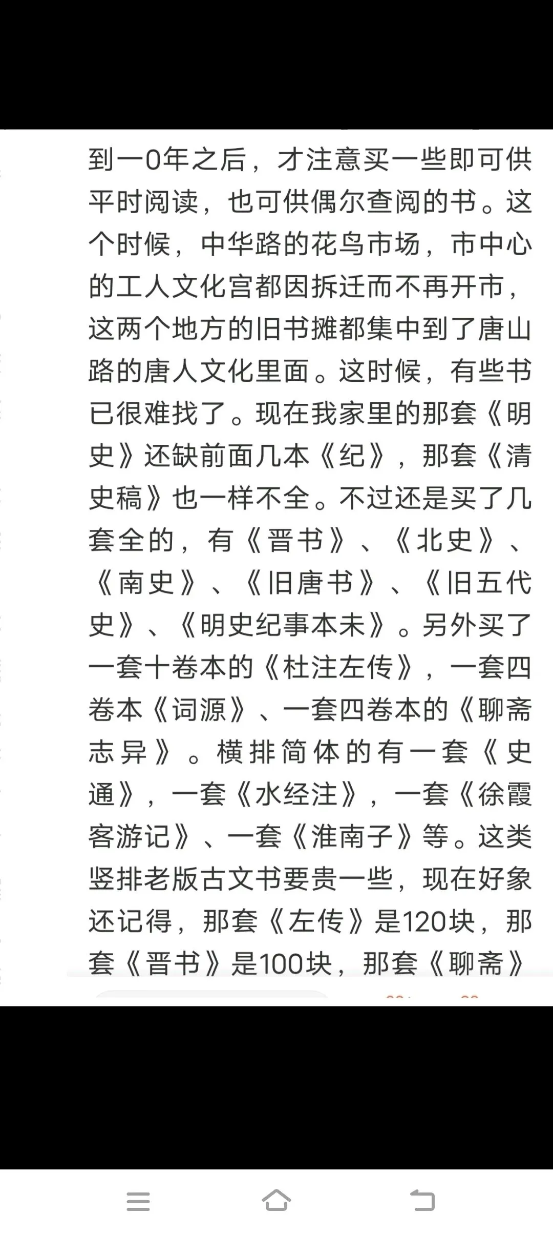 到一0年之后,才注意买一些要既可供平时阅读,也可供偶尔查阅的书。这个时候,中华路的花鸟市场,市中心的工人文化宫都因拆迁而不再开市,这两个地方的旧书摊都集中到了唐山路的唐人文化里面。这时候,有些书已很难碰到了。现在我家里的那套《明史》还缺前面几本《纪》,那套《清史稿》也一样不全。不过还是买了几套全的,有《晋书》、《北史》、《南史》、《旧唐书》、《旧五代史》、《明史纪事本未》。另外买了一套十卷本的《杜注左传》,一套四卷本《词源》、一套四卷本的《聊斋志异》。横排简体的有一套《史通》,一套《水经注》,一套《徐霞客游记》、一套《淮南子》等。这些旧版竖排书要贵一些,成套的每本一般用15至20元,现在还记得,那套《左传》似乎花了120块,《晋书》是100块,《聊斋》是70块。不成套的要便宜得多,每本也就五块左右。