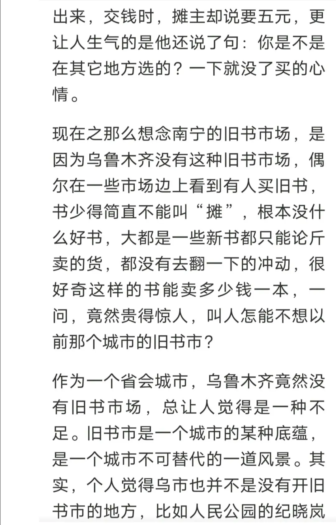 作为一个省会城市,乌鲁木齐竟然没有旧书市场,总让人觉得是一种不足。旧书市是一个城市的某种底蕴,是一个城市不可替代的一道风景。其实,个人觉得乌市也并不是没有开旧书市的地方,比如人民公园的纪晓岚纪念园那块,南湖公园里艺术群雕那一带,都是挺合适的地方。