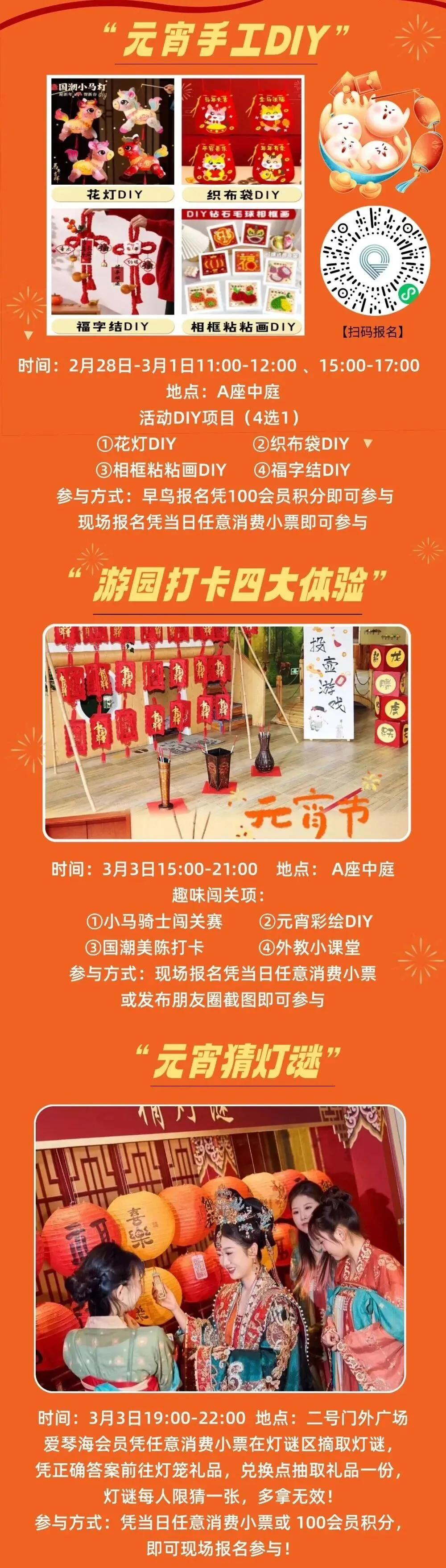 5.元宵节期间,开展元宵手工DIY、游园打卡、猜灯谜等活动。