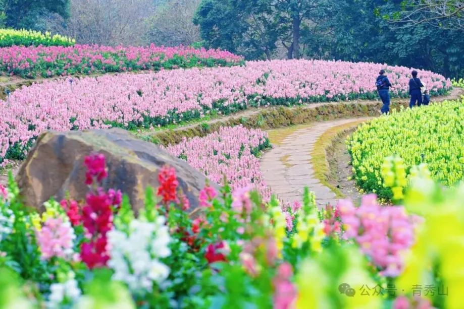 在花田区域,4500平方米的大波斯花海正在绽放,与热情灿烂的炮仗花交相辉映。炮仗花似火般热烈开放,橙红的花瓣如同一串串点燃的鞭炮,宣告着新春的喜悦。大波斯与炮仗花的交织,为春日画卷添上了明艳的色调,共同勾勒出一幅如梦如幻的春日盛景。