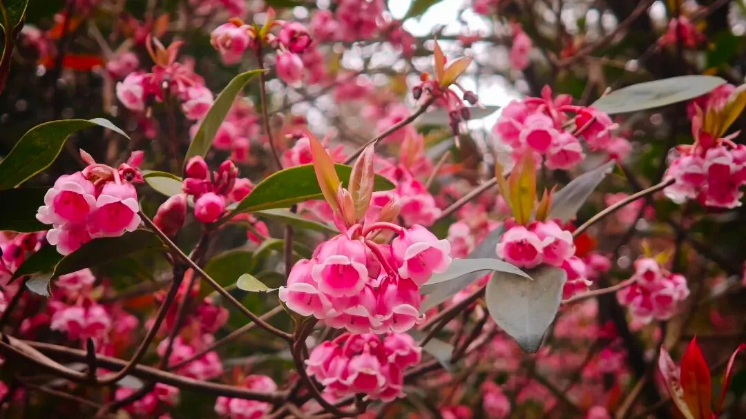 吊钟花,别名灯笼花,伞形花序顶生,常5朵—8朵,下垂,花冠钟状,粉红色。花期春初三月,在大明山约16公里处,越过山后,一片色彩斑斓:深深浅浅的红在雾里隐约若现,如仙境一般。吊钟花的花朵较小,每株树挂满一串串花朵,成簇成串的开得争先恐后,真如满树的粉红小灯笼。风过处,微微摇荡,如风铃儿晃动,在雾气中更显娇艳欲滴。