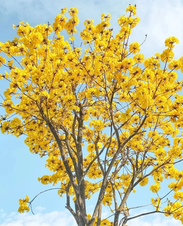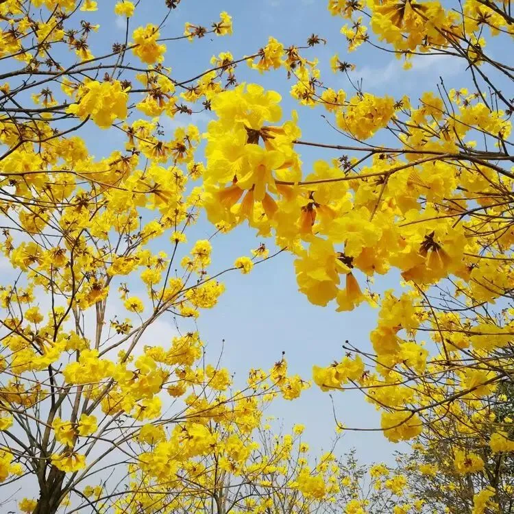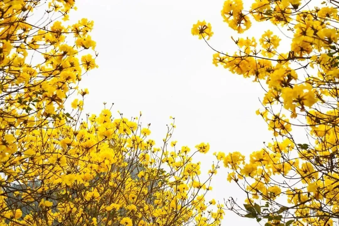 黄花风铃木是春天来临时的指示植物之一,其花远观似黄金璀璨,近看又如风铃摇曳,惹眼的暖黄色花朵,傲立枝头,净而纯粹。南宁市江南公园内种植有近万株黄花风铃木,分布在园内的各处景点,风铃报春、风铃听泉、风铃谷等都是赏花的好去处。黄花风铃木的花期不长,晴好之时亦只有十天半月的最美观赏期。春风拂面,花儿或翩翩起舞、随风摇曳,横看侧看都是画,仰视平视都是诗。随手拈一朵凋零的落花,轻轻的撕开,精密的构造,和谐的搭配,真是一花一世界。
