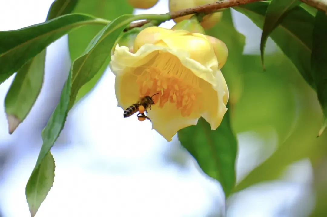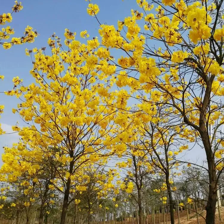 黄花风铃木四季景象各异,有春华、夏实、秋绿、冬枯的独特风韵,具有极高的观赏价值,被冠以热带樱花的美称。黄花风铃木花色亮黄,花期可见大量岜博山原生山野生昆虫及蜜蜂传粉。