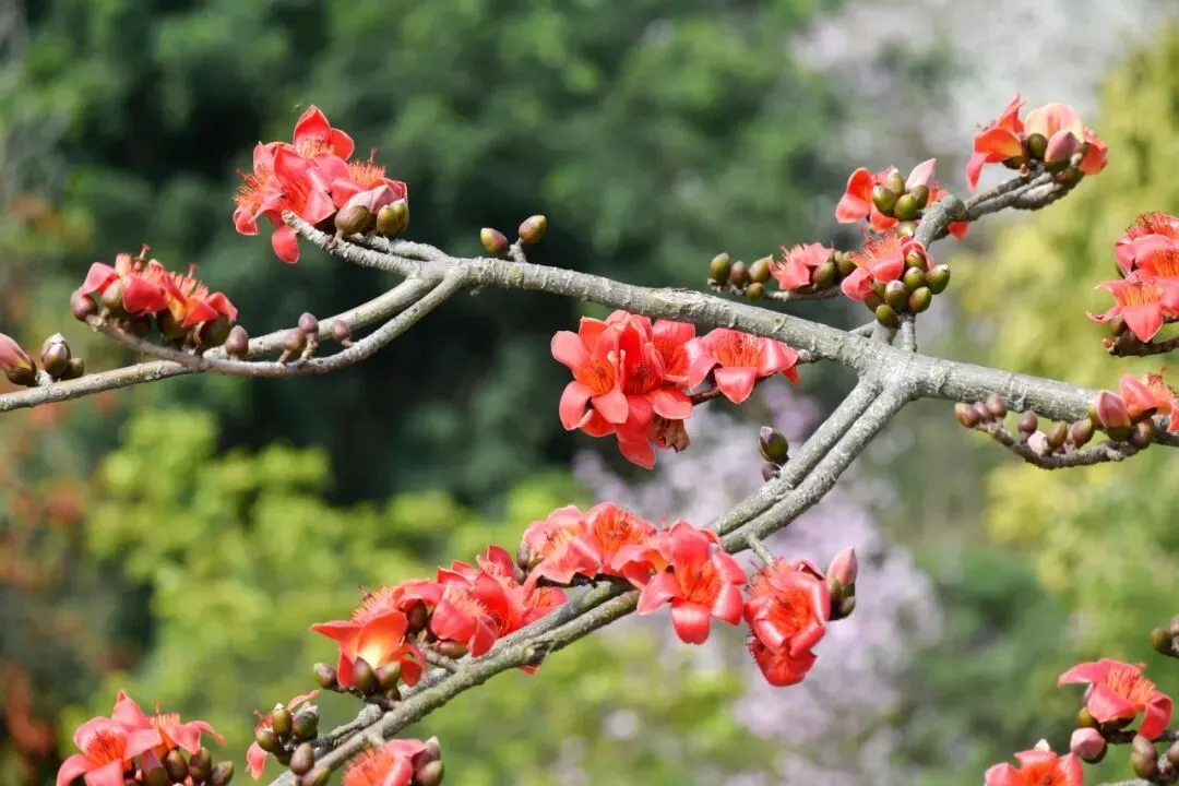 木棉,落叶大乔木,高可达25米以上,树形雄壮魁梧,枝干挺拔舒展,呈现出一种顶天立地的姿态。典型的“先花后叶”花木,即先满树繁花,花落后再长新叶,花朵凋落时姿态完整。因其挺拔的树姿与不萎落的花姿,自清代起被赋予“英雄树”的美名。硕大的花朵好似倒擎的火红杯盏,花期盛时,密集的繁花在枝头簇拥成片,远望宛若片片灼灼的彤云,高悬于林木之上,将南国的天空与山水都染上明丽的光彩。
