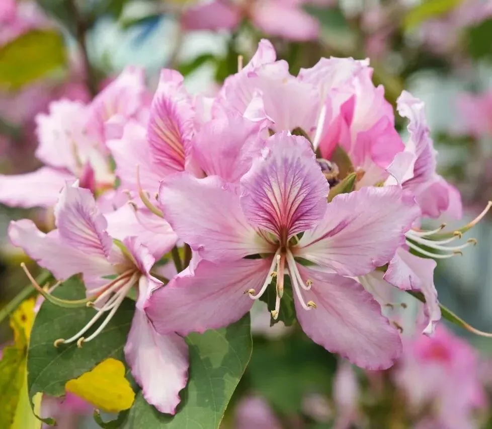 洋紫荆开花时满树繁花,几乎无叶,粉色或淡紫色花瓣,偶有白色变种,是华南地区春季的标志性花卉,象征生机与浪漫。洋紫荆主要分布于公园的风铃报春、风铃广场附近、东门广场入口处。