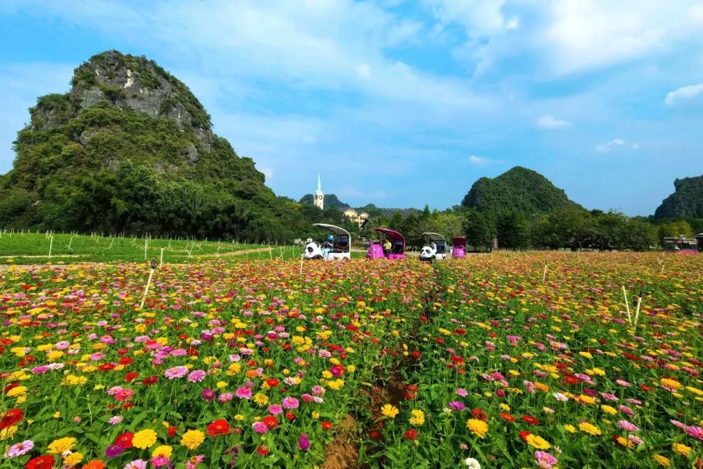 1.5万平方米的土地上,格桑花汇成了波澜壮阔的缤纷海洋。无数红、粉、白、紫的花朵在阳光下摇曳,如同繁星洒落草原,随风涌起层层彩浪,充满自由野性的生命力。步入广西园“那之境”,1200平方米的格桑花更显精巧诗意。它们与田园山水、潺潺溪流相映,簇拥成一片柔软而坚韧的花毯。