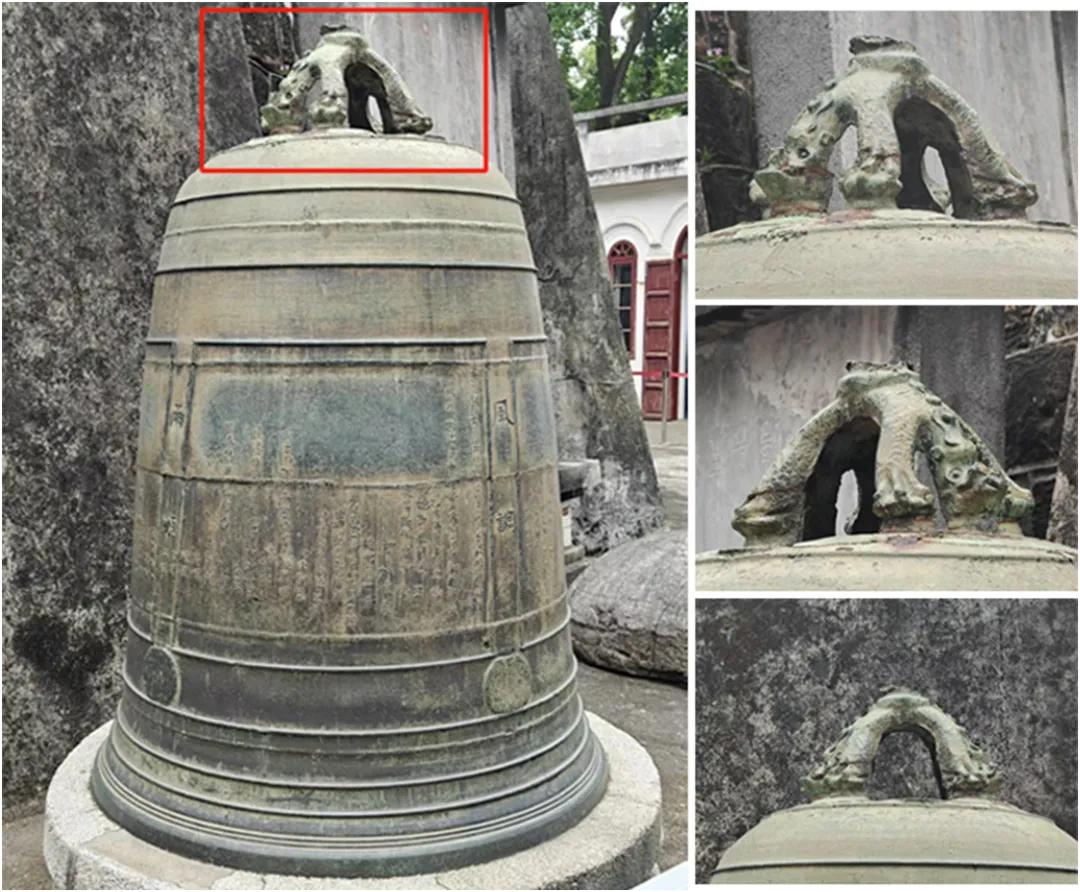 放置在南宁人民公园镇宁炮台上的平安大钟,原是南宁钟鼓楼上的铜钟。其质地古朴,外观厚重,给人一种沉稳敬畏之感。铜钟顶部饰有一只背部弯拱的龙形兽钮,其便是神话传说中“龙生九子”之一的“蒲牢”。