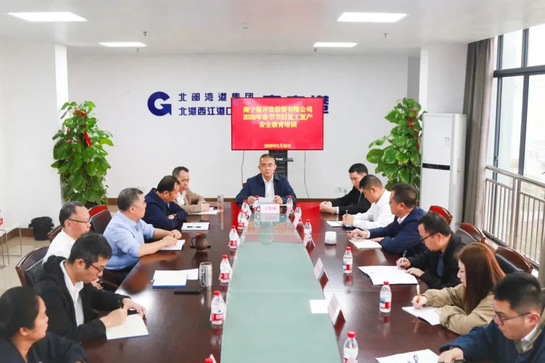 2026年2月26日,南宁港组织召开春节节后复工复产专题工作部署会。会议深入学习习近平总书记关于安全生产重要论述、传达近期自治区、集团公司和北港西江港口关于安全生产工作要求,通报春节期间国内发生的安全事故经验教训,全面部署2026年重点经营任务及节后复工复产工作,夯实安全之基,衔接运河发展,以稳定生产赋能港口提增效,奋力开创运营发展新局面。会议由公司副总经理陈流主持,公司党总支书记、执行董事、总经理、安委会主任王发坤作工作讲话,公司安委会成员,领导班子、各作业区、各部门负责人等相关人员参加会议。