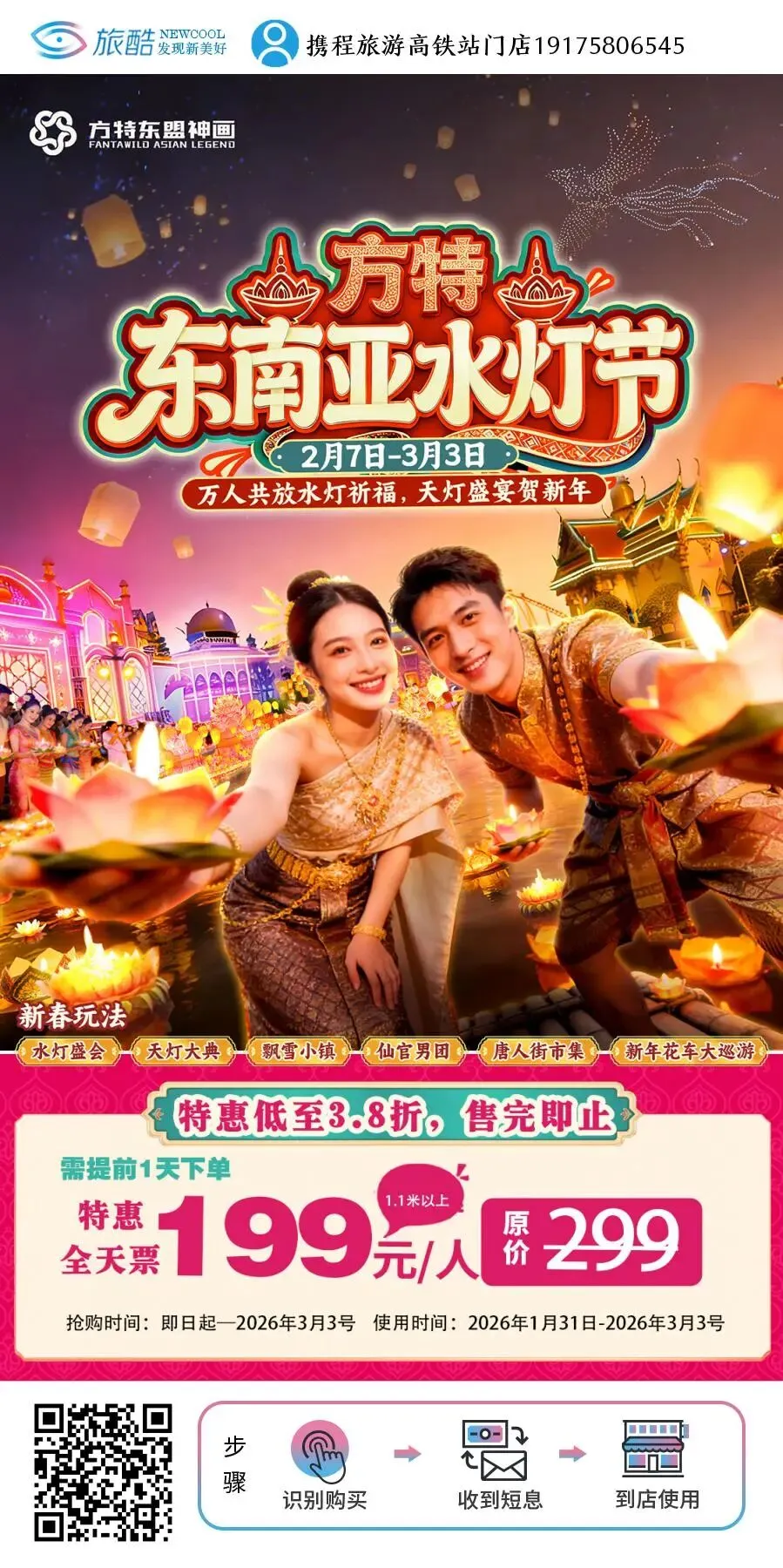 6.效期:购买2026年1月31日起至3月3日期间任选一天使用,其他日期不可用。游玩日期当天,门票仅限使用一次,出园后再入园需重新购票。门票不支持改期。