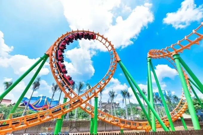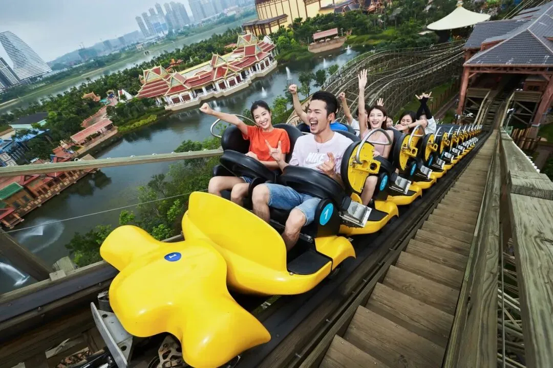 丛林飞龙是一款十分经典的木制过山车,也是广西壮族自治区第一座木制过山车,包含了急速下滑、旋转、穿越等多种模式,最高时速可达90km/h。