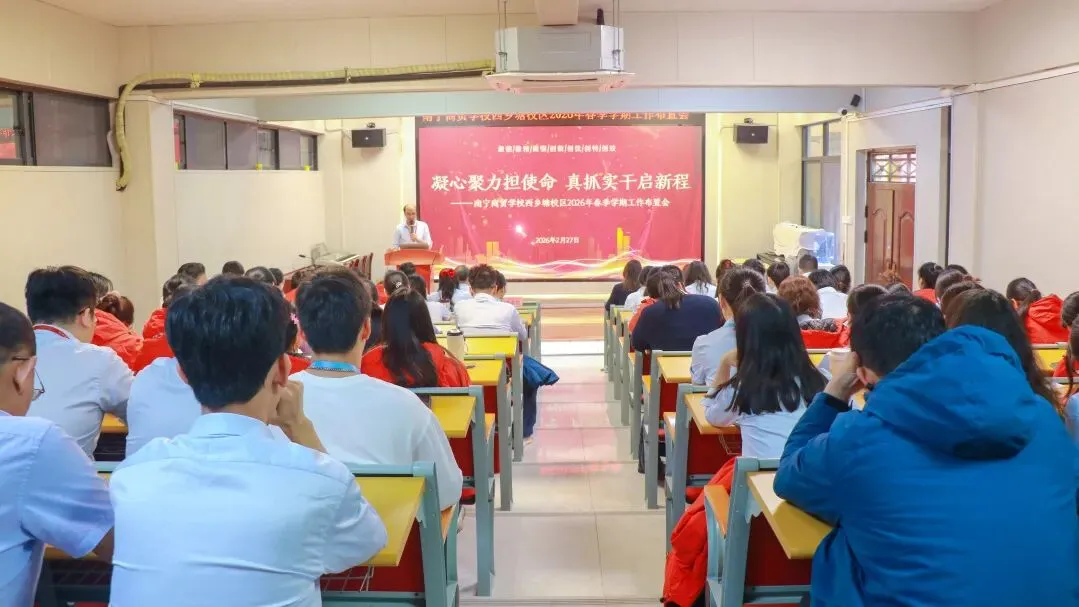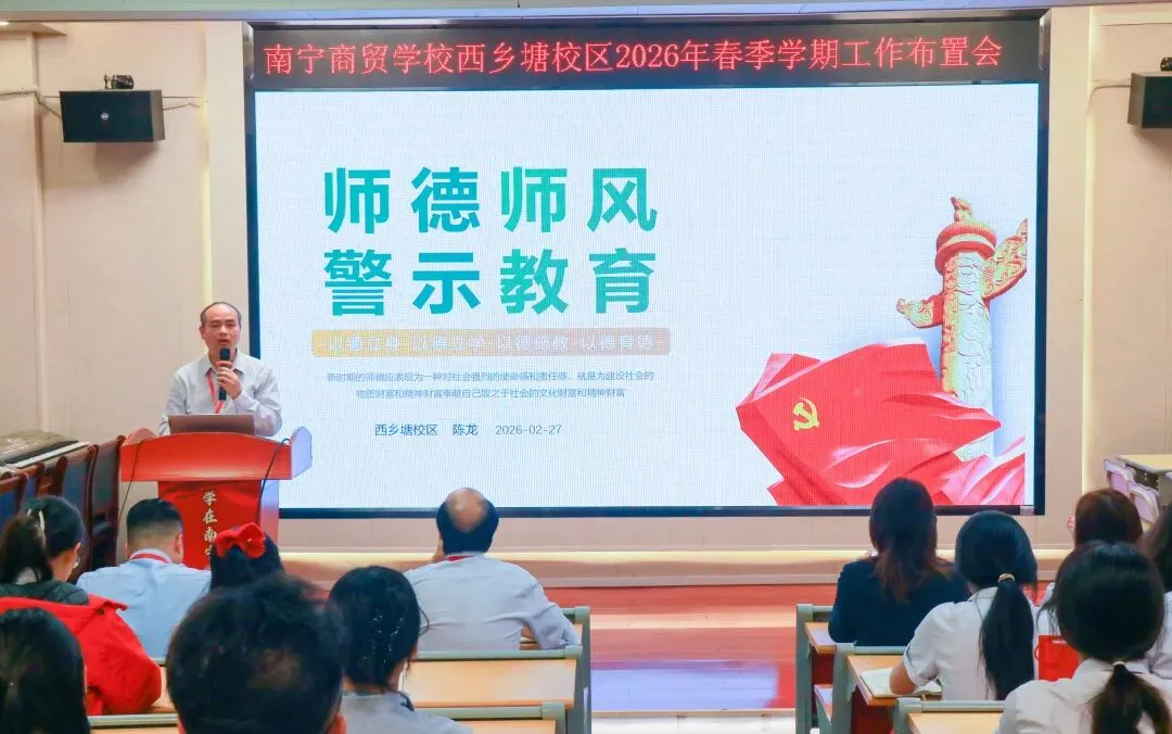 金马迎春启新序,匠心育人正当时。为全面谋划 2026 年春季学期各项工作,明确目标,确保新学期有序起步,南宁商贸学校西乡塘校区召开春季学期教师工作布置会,全体教职工以饱满的精神状态齐聚一堂,共商育人大计,共绘发展蓝图。