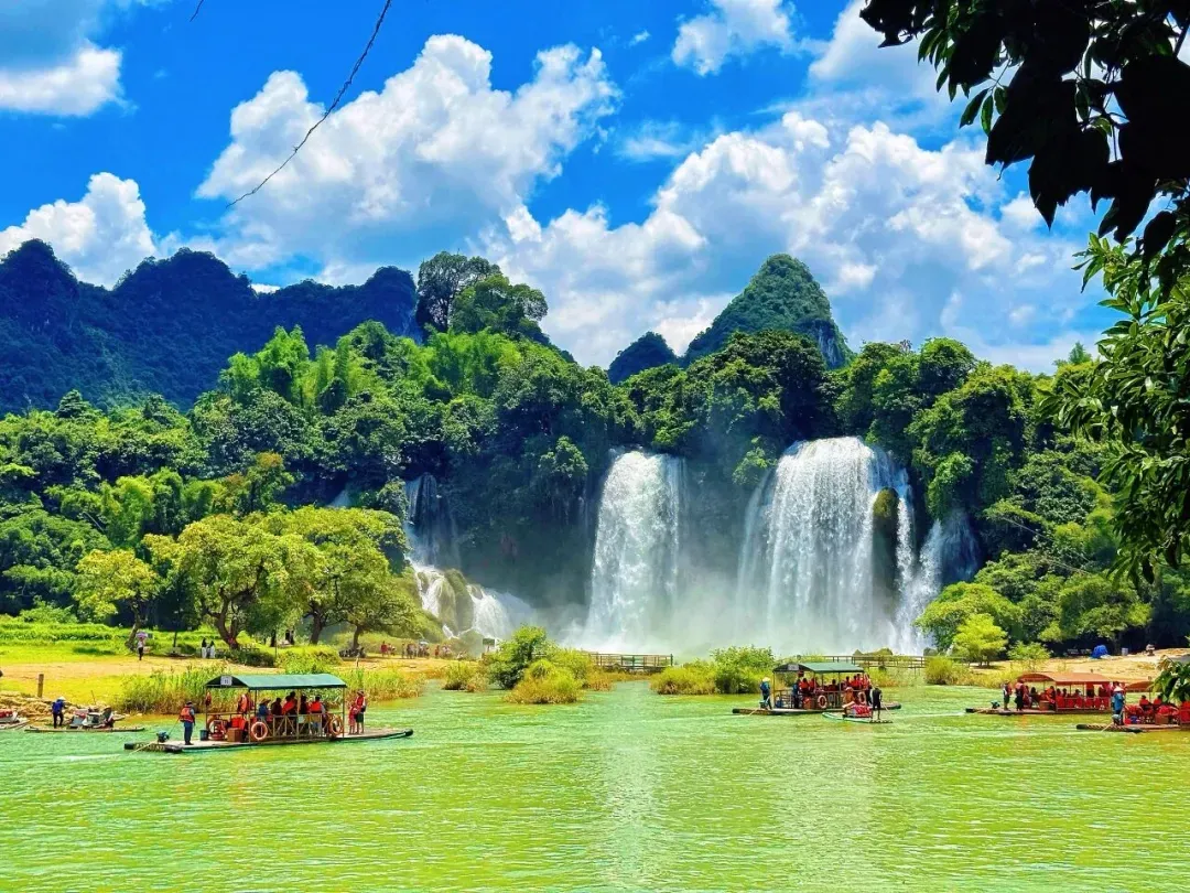 下午乘车前往国家特级景点--【德天跨国大瀑布风景区】徒步进入景区游览亚洲第一大、世界第四大跨国瀑布,瀑布由【中国德天瀑布】和【越南板约瀑布】相连构成,横跨中越两国边境,宽208米,落差70米,纵深60米,三级跌落,雄奇壮阔!