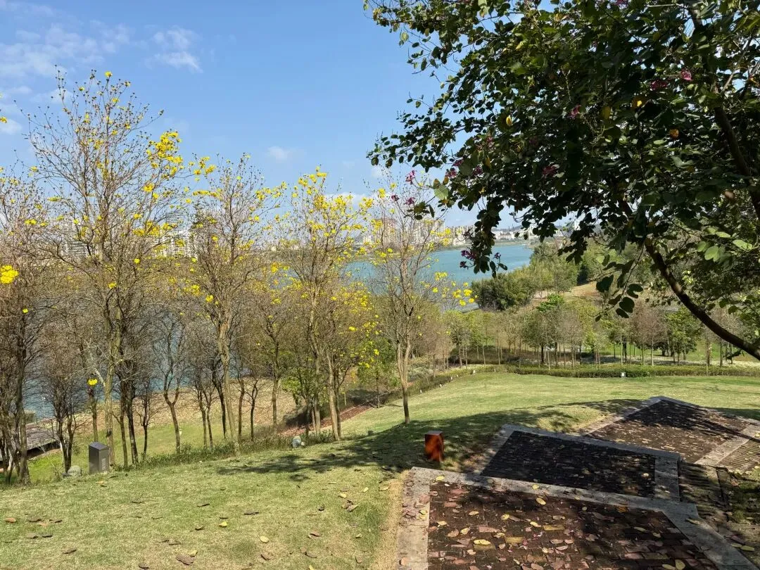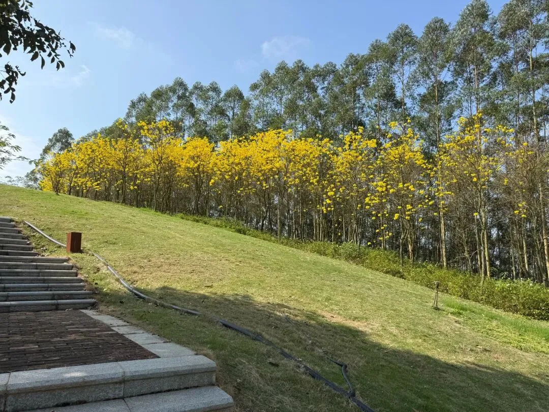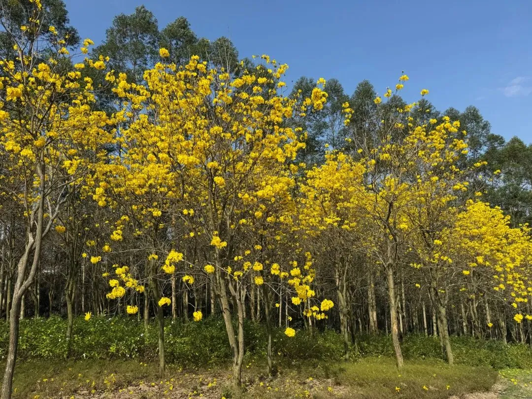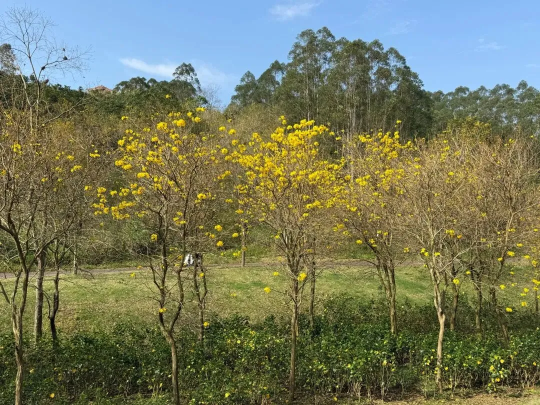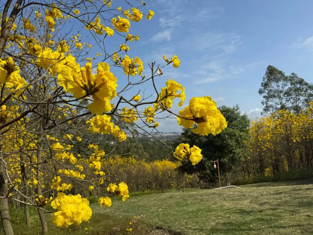 山坡上、草地上,黄花风铃木连成一排,明艳的黄花在枝头簇拥,迎接着春天的到来。在南宁蒲庙镇,藏着一处黄花风铃谷,花朵正在慢慢开放,虽然不及青秀山的花开得密集,但也足以让人欣喜。重点是这里免费。