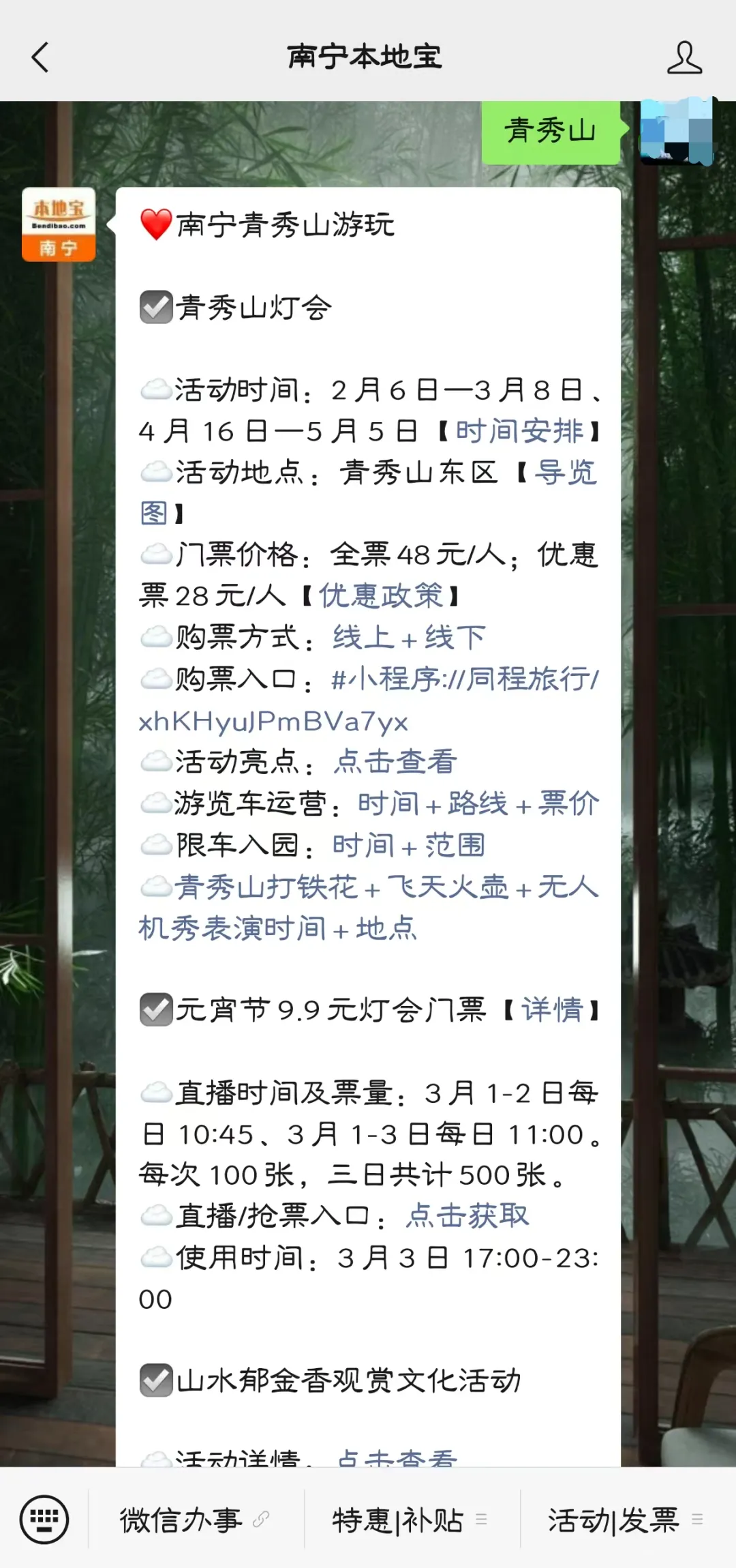 关注【南宁本地宝】公众号,在对话框回复【青秀山】,获青秀山9.9元票抢票入口、灯会游玩攻略、购票入口等。