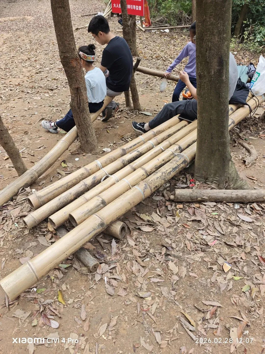 我们来到一片小竹林歇息地,看到山民用砍来的竹竿,捆扎在树根旁,做成一排排竹凳,供上山游客乘凉、休息、补充能量。路中间挂着横幅:“趴菜户外,敬畏自然,守护青山”,左边还挂着“祝贺百万人净山活动圆满结束”的红色横幅。